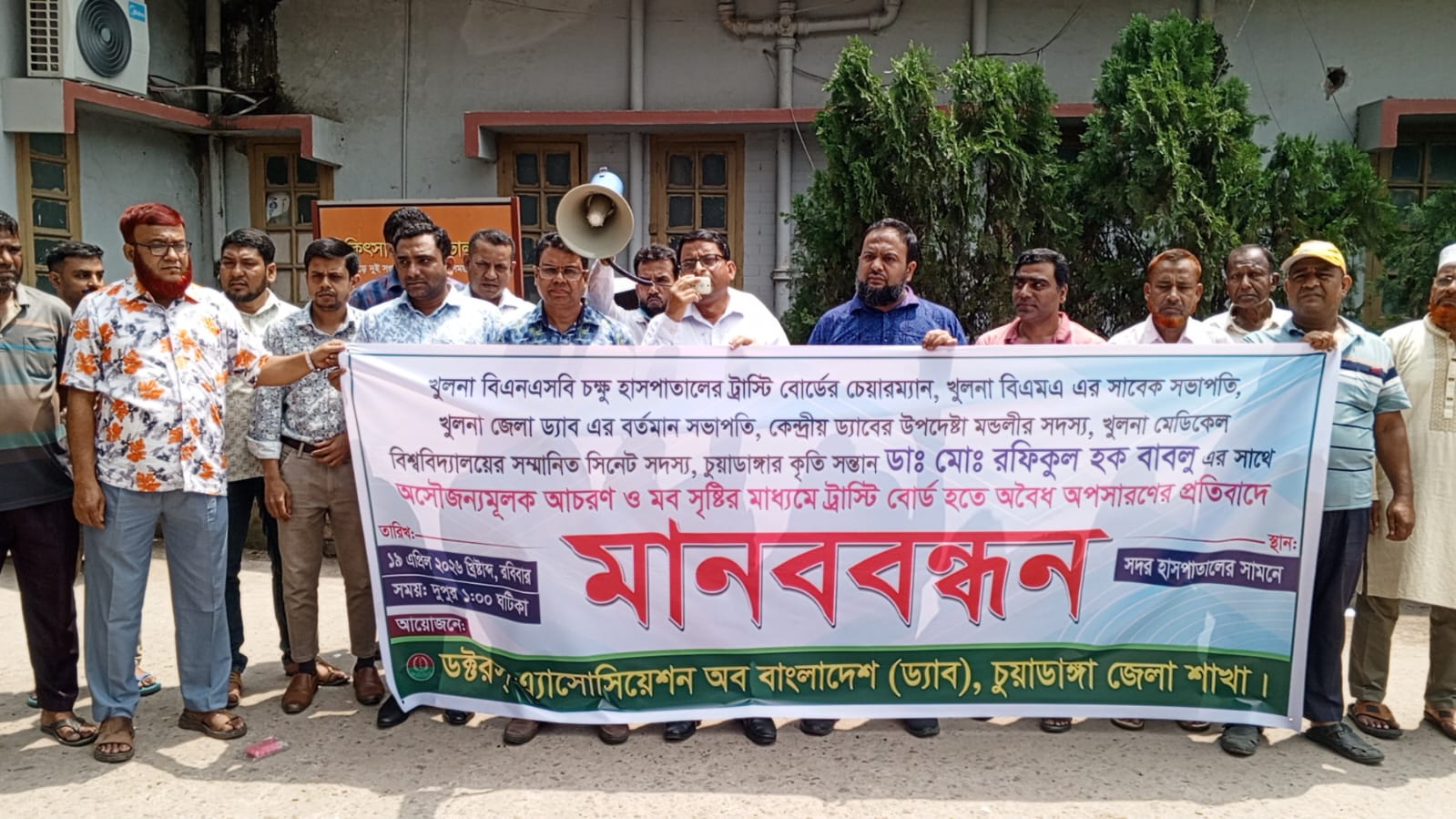 খুলনা বিএনএসবি চক্ষু হাসপাতালের ডা. রফিকুল হকের সাথে অসৌজন্যমূলক আচরণের প্রতিবাদে চুয়াডাঙ্গায় মানববন্ধন