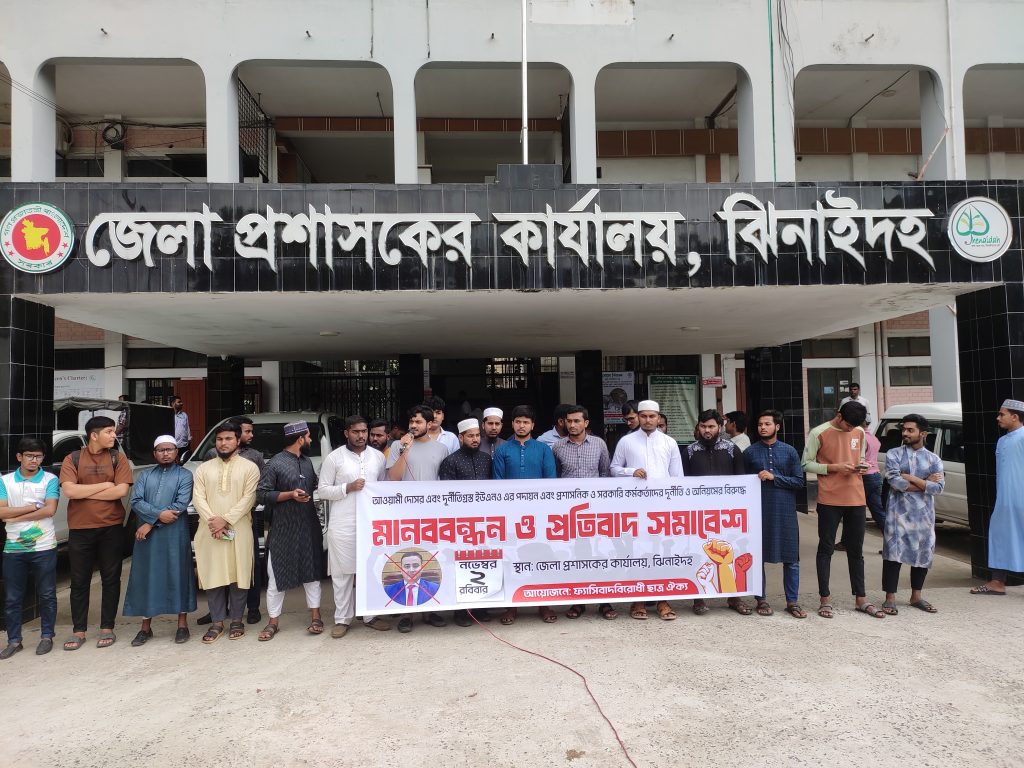 ঝিনাইদহে ইউএনও’র অপসারণের দাবিতে মানববন্ধন ও প্রতিবাদ সমাবেশ