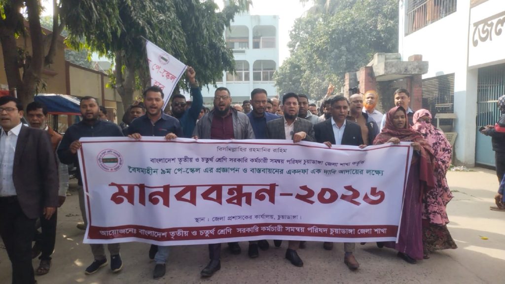 চুয়াডাঙ্গায় বৈষম্যহীন ৯ম পে-স্কেলের দাবিতে ৩য় ও ৪র্থ শ্রেণির সরকারি কর্মচারীদের মানববন্ধন