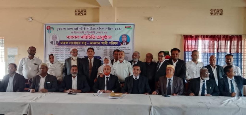 বাংলাদেশ জাতীয়তাবাদী আইনজীবী ফোরামের চুয়াডাঙ্গা কমিটির আহবায়ক আ.স.ম. আব্দুর রউফের সভাপতিত্বে ফোরামের সদস্য সচিব মানজার আলী জোয়ার্দ্দার হেলাল সভা সঞ্চালনা করেন। সভায় জাতীয়তাবাদী আইনজীবী ফোরামের সভাপতি পদে মারুফ সরোয়ার বাবু, সহসভাপতি পদে সিরাজুল ইসলাম (১) ও আব্দুল্লা-আল-মামুন, সাধারণ সম্পাদক পদে আহসান আলী, যুগ্ম-সাধারণ সম্পাদক পদে আফরুজা আকতার ও মশিউর রহমান পারভেজ, কোষাধ্যক্ষ পদে এস.এন..এ. হাশেমী, ক্রীড়া সম্পাদক পদে আতিয়ার রহমান (২) ও গ্রন্থাগার সম্পাদক পদে রুবিনা পারভীন প্রতিদ্বন্দ্বিতা করছেন। কার্যনির্বাহী সদস্য পদে ফরজ আলী , রাগিব আহসান, আশিকুর রহমান রাজ, মো. আক্তারুজ্জামান , শরিফুল ইসলাম (২) ও তানভীর আহম্মদ শাওন প্রতিদ্বন্দ্বিতা করছেন। সভায় পবিত্র কোরআন থেকে তেলওয়াত করেন সিরাজুল ইসলাম।
