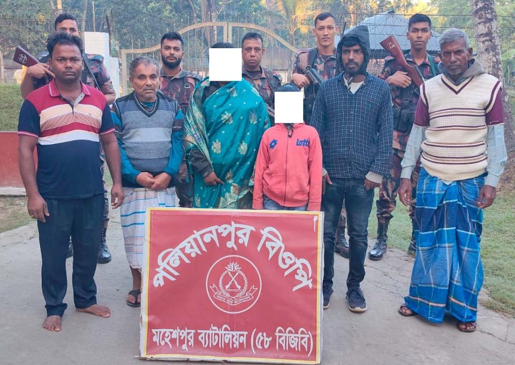 অপরদিকে গতকাল বুধবার রাত সাড়ে ১২টার দিকে কুসুমপুর বিওপি’র সীমান্ত পিলার-৬১/১৪-আর এর কাছে চাপাতলা গ্রামে হাবিলদার মোঃ মনোয়ার হোসেন এর নেতৃত্বে নিয়মিত টহল পরিচালনা করে। এ সময় অবৈধভাবে বাংলাদেশ হতে ভারতে যাওয়ার চেষ্টাকালে ৪ জনকে আটক করা হয়। এর মধ্যে ১ জন নারী, ২ জন শিশু ও ১ জন পুরুষ। আটক পুরুষ হরলাল হাওলাদার (৪২), পিরোজপুর জেলার মঠবাড়িয়া থানার বাসিন্দা। এদিকে একই দিন সকাল ৬টার দিকে খোসালপুর বিওপি’র সীমান্ত পিলার-৬০/৭৪-আর এর কাছে খোশালপুর গ্রামে হাবিলদার মোঃ তোফাজ্জল হোসেন এর নেতৃত্বে নিয়মিত টহল পরিচালনা করা হয়। এ সময় অবৈধভাবে বাংলাদেশ হতে ভারতে অনুপ্রবেশের সময় ৫ জনকে আটক করা হয়। এর মধ্যে ১ জন পুরুষ, ১ জন নারী ও ৩ জন শিশু। আটক পুরুষ নিত্য মজুমদার (৪৮), গোপালগঞ্জ জেলার কাশিয়ানী থানার বাসিন্দা। একই দিন সকাল সাড়ে ৬টার দিকে পলিয়ানপুর বিওপি’র সীমান্ত পিলার-৬০/১৮-আর এর নিকট পলিয়ানপুর গ্রামে হাবিলদার মনিরুজ্জামান সিকদার এর নেতৃত্বে নিয়মিত টহল পরিচালনা করে। এ সময় অবৈধভাবে বাংলাদেশ হতে ভারতে যাওয়ার সময় ৬ জনকে আটক করা হয়। এর মধ্যে ৪ জন পুরুষ, ১ জন নারী ও ১ জন শিশু। আটক পুরুষ সদস্যরা হলো গোপালগঞ্জ জেলার কাশিয়ানী থানার রাহুথড় গ্রামের জগবন্ধু সিকদার (৭৪, অনুপম সিকদার (৩৭), গৌরাঙ্গ সিকদার (৩৯), ও মহাটালী গ্রামের হরষিৎ বালা (৫৭)। আটককৃতদের মহেশপুর থানায় সোর্পদ করা হয়েছে। ন
