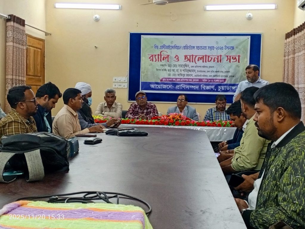 চুয়াডাঙ্গায় বিশ্ব এ্যান্টিমাইক্রোবিয়াল রেজিস্ট্যান্স সচেতনতা দিবস উপলক্ষে র্যালি ও আলোচনা সভা অনুষ্ঠিত হয়েছে। বৃহস্পতিবার বেলা ৩টায় চুয়াডাঙ্গা জেলা প্রাণিসম্পদ অফিস থেকে একটি র্যালি বের করা হয়। র্যালিটি শহরের বিভিন্ন সড়ক প্রদক্ষিণ করে একই স্থানে এসে শেষ হয়। র্যালি শেষে প্রাণিসম্পদ অফিসের সম্মেলন কক্ষে এক আলোচনা সভা অনুষ্ঠিত হয়। সভায় জীবননগর উপজেলা প্রাণী সম্পদ কর্মকর্তা ডাঃ সাইফুল ইসলামের সঞ্চালনায় সভাপতিত্ব করেন জেলা প্রাণিসম্পদ অফিসার ডাঃ সাহাবুদ্দিন।
