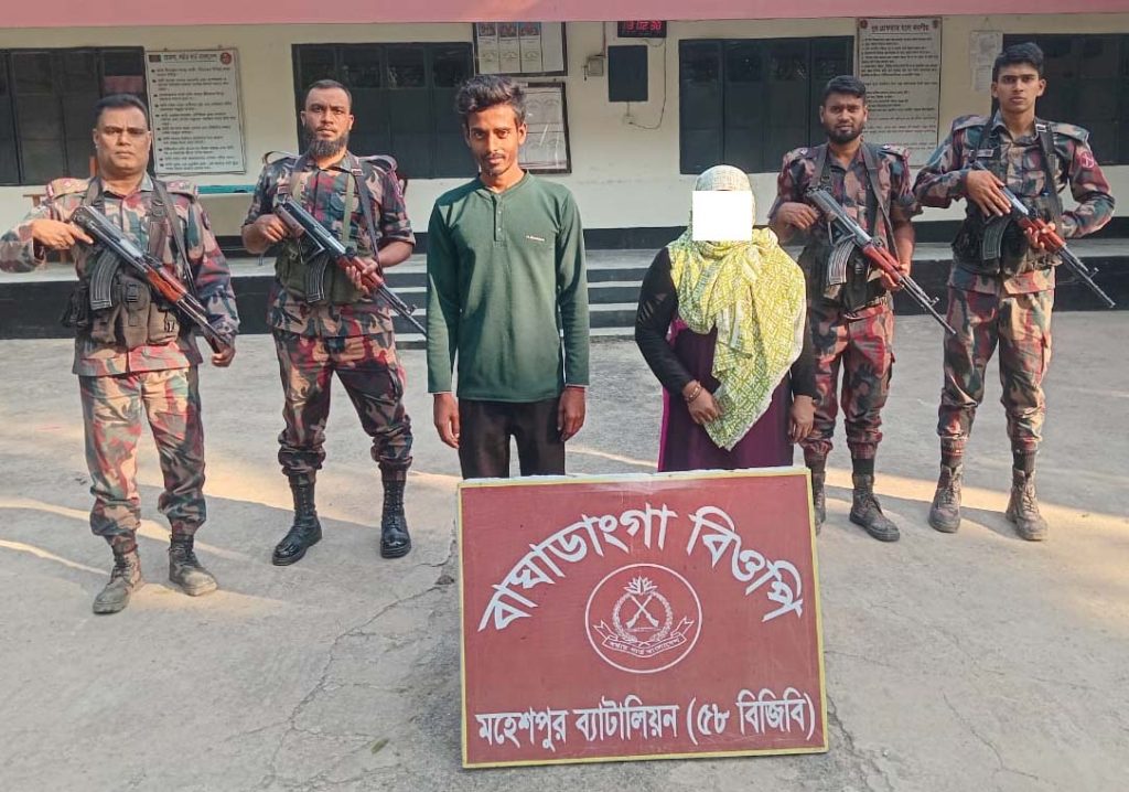 অপরদিকে বৃহস্পতিবার বিকাল ৪টার দিকে বাঘাডাংগা বিওপি’র সীমান্ত পিলার-৬০/৩৩-আর এর নিকট হুদাপাড়া গ্রামে নায়েক মোঃ জহির রায়হান এর নেতৃত্বে নিয়মিত টহল পরিচালনা করে। এ সময় অবৈধভাবে বাংলাদেশ হতে ভারতে যাওয়ার চেষ্টাকালে ২ জনকে আটক করা হয়। এর মধ্যে জিল্লুর রহমান(২৭), যশোর জেলার ঝিকরগাছা থানার দিগডানা গ্রামের মোঃ শহিদুল ইসলামের ছেলে। আটককৃতদের মহেশপুর থানায় হস্তান্তর করা হয়েছে।