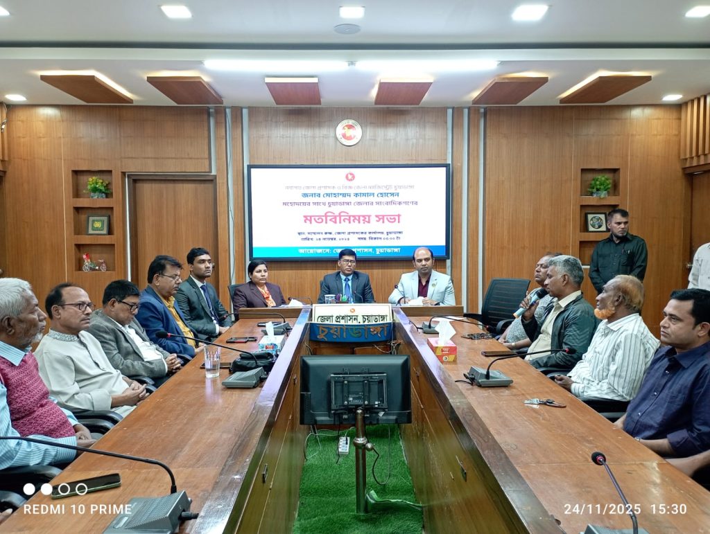 জেলা প্রশাসক মোহাম্মদ কামাল হোসেন বলেন, আমি প্রথম জেলা প্রশাসক হিসেবে নিযুক্ত হয়েছি। এই জেলাকে চিনতে এবং জানতে সাংবাদিকদের সহায়তা প্রয়োজন। চুয়াডাঙ্গার প্রধান নদী মাথাভাঙ্গা দূষণের হাত থেকে রক্ষা করতে আমরা বদ্ধ পরিকর। পরবর্তীতে কেউ যদি মাথাভাঙ্গা নদী দুষণ ও দখল করে তাহলে প্রশাসন তাদের বিরুদ্ধে ব্যবস্থা নেবে। সামনে আসন্ন জাতীয় সংসদ নির্বাচন আমাদের জন্য একটি বড় চ্যালেঞ্জ। বিগত নির্বাচনের তুলনায় এবার ভিন্ন রকম নির্বাচন অনুষ্ঠিত হবে। এবারের নির্বাচন অন্য জাতীয় নির্বাচন থেকে একটু ভিন্ন। আসন্ন নির্বাচনে দুটি ব্যালট থাকবে। একটি গণভোটের ব্যালট ও অন্যটি সংসদ নির্বাচনের ব্যালট। এবারই প্রথম নির্বাচনে প্রবাসী ও সরকারী কর্মচারীরা ভোট দানের সুযোগ পাবে। আমরা এমন একটি নির্বাচন উপহার দিতে চাই, যেটা দৃষ্টান্ত হয়ে থাকবে। একটি সুষ্ঠু ও নিরপেক্ষ নির্বাচন সবাইকে উপহার দেবো এটি আমার ওয়াদা। জনমনে জাতীয় নির্বাচন সম্পর্কে পজিটিভ ধারণা দিতে সকল সাংবাদিকের সহায়তা প্রয়োজন।