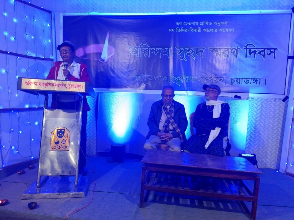 ‘তব চেতনায় প্রাণিত অনুক্ষণ, মম তিমির-বিদারী আলোর অন্বেষণ’ এ প্রতিপাদ্যকে ধারন করে চুয়াডাঙ্গায় অরিন্দম-সুহৃদ স্মরণ দিবসে অরিন্দমের প্রয়াত ২৭ সদস্যকে স্মরণ করা হয়েছে। সোমবার সন্ধ্যা ৬টায় জেলা শিল্পকলা একাডেমির সম্মেলন কক্ষে এ স্মরণ দিবসটি আয়োজন করেন অরিন্দম সাংস্কৃতিক সংগঠন। শুরুতেই প্রয়াত সদস্যদের স্মরণে ১ মিনিট নিরবতা পালন করা হয়। অরিন্দম সদস্যদের সমবেতকন্ঠে আগুনের পরশমণি ছোয়াও প্রানে সঙ্গীত পরিবেশনের মাধ্যমে অনুষ্ঠানের সূচনা হয়। এরপর প্রয়াত সদস্যদের স্মরণে সুহৃদ কথন পাঠ করেন সংগঠনের সাহিত্য প্রচার প্রচারণা সম্পাদীকা সুমিতা দে। পরে প্রয়াত সদস্যদের স্বরনে শুরু হয় আলোচনা সভা।