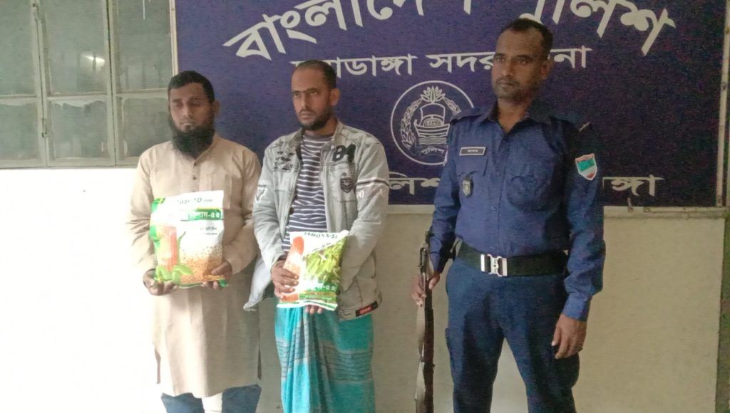 চুয়াডাঙ্গায় কৃষকদের সঙ্গে প্রতারণা করে নকল ভুট্টাবীজ বিক্রির অভিযোগে প্রতারকচক্রের দুই সদস্যকে আটক করেছে সদর থানা পুলিশ। গতকাল সোমবার দুপুরে চুয়াডাঙ্গা শহরতলীর কুলচারা এলাকায় এ অভিযান চালানো হয়। এ সময় তিন বস্তা প্যাকেটজাত ভেজাল ভুট্টাবীজসহ চক্রের মূল হোতা ইমরান হোসেন (৩৫) ও সহযোগী মুজিবুর রহমানকে (৪০) পুলিশ গ্রেপ্তার করে।