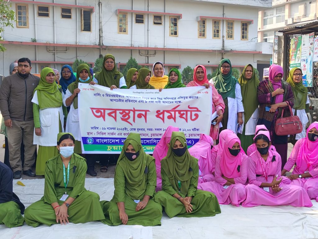 অবস্থান ধর্মঘটকালে বক্তার বলেন, জনবান্ধব নার্সিং ও মিডওয়াইফারি সেবা ও শিক্ষা ব্যবস্থাপনা গড়ে তুলতে নার্স-মিডওয়াইফদের ৮ দফা দাবি বাস্তবায়নের দাবি মানা না হলে, আগামী ২ ডিসেম্বর দেশের সকল স্বাস্থ্যসেবা এবং নার্সিং মিডওয়াইফারি শিক্ষা প্রতিষ্ঠানে কমপ্লিট শাটডাউন ঘোষনা করা হবে। ৪৮ বছরের ঐতিহ্য ও অগ্রগতির স্বতন্ত্র নার্সিং প্রশাসন, নার্সিং ও মিডওয়াইফারি অধিদপ্তরকে বিলুপ্ত করে ভিন্ন অধিদপ্তরে একিভূত করণের অপচেষ্টা বন্ধ করে দাবি মেনে নেওয়ার আহবান জানানো হয়।