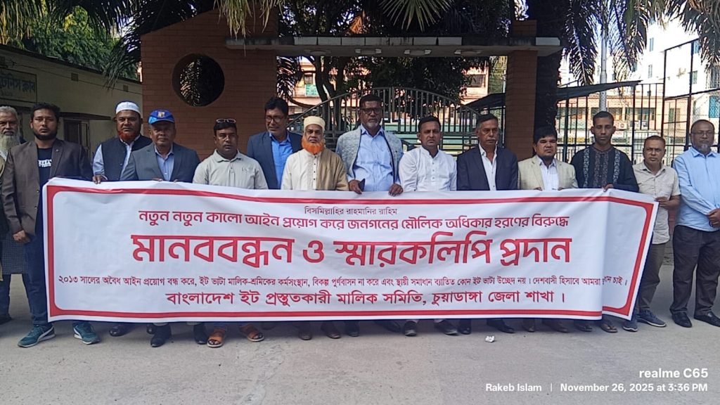 চুয়াডাঙ্গায় ৭ দফা দাবিতে জেলা ইট প্রস্তুতকারী মালিক সমিতির উদ্যোগে মানববন্ধন ও জেলা প্রশাসকের মাধ্যমে প্রধান উপদেষ্টা এবং পরিবেশ, বন ও জলবায়ু পরিবর্তন মন্ত্রণালয় বরাবর স্মারকলিপি পেশ করা হয়েছে। বুধবার বিকেল সাড়ে ৩টায় চুয়াডাঙ্গা প্রশাসকের কার্যালয় চত্বরে জেলা ইট প্রস্তুতকারী মালিক সমিতির পক্ষ থেকে মানববন্ধনের আয়োজন করা হয়। মানববন্ধন শেষে চুয়াডাঙ্গা জেলা প্রশাসক মোহাম্মদ কামাল হোসেনের মাধ্যমে স্মারকলিপি পেশ করা হয়।