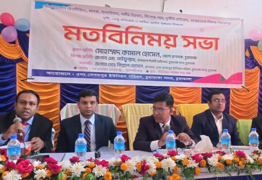 চুয়াডাঙ্গা সদর উপজেলার বেগমপুর ইউনিয়ন পরিষদে যৌন হয়রানি, ইভটিজিং, মাদক, বাল্যবিবাহ ও ধর্মীয় উগ্রবাদ, কিশোর গ্যাং, দূনীতি প্রতিরোধ, আত্মহত্যার বিরুদ্ধে সচেতনতা সৃষ্টি ডেঙ্গু প্রতিরোধ ও সার্বিক আইন শৃংখলা বিষয়ক মতবিনিময় সভা অনুষ্ঠিত হয়েছে। বৃহস্পতিবার বেলা ১১টায় বেগমপুর ইউনিয়ন পরিষদ হল রুমে উক্ত মতবিনিময় সভা অনুষ্ঠিত হয়। মতবিনিময় সভায় প্রধান অতিথি উপস্থিত থেকে বক্তব্য রাখেন চুয়াডাঙ্গা জেলার নবাগত জেলা প্রশাসক মোহাম্মদ কামাল হোসেন।