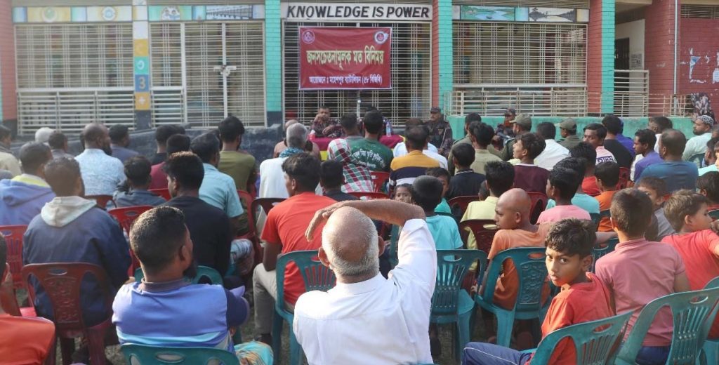 মহেশপুর বিজিবির সহকারী পরিচালক মুন্সী ইমদাদুর রহমান এক প্রেসবিজ্ঞপ্তিতে জানান, জীবননগর উপজেলার নর্বদূর্গাপুর সরকারি প্রাথমিক বিদ্যালয় মাঠে ঘন্টাব্যাপী এ মতবিনিময় সভা অনুষ্ঠিত হয়। সভায় প্রধান অতিথি ছিলেন ৫৮-বিজিবির অধিনায়ক লেঃ কর্নেল মোঃ রফিকুল আলম পিএসসি। সভায় লেঃ কর্নেল মোঃ রফিকুল জনসাধারনকে বলেন, বর্তমানে পার্শ্ববর্তী রাষ্ট ভারতে এসআইআর (ঝওজ) এর নামে উচ্ছেদ অভিযান চলছে। এ প্রেক্ষিতে, বিএসএফ কর্তৃক সীমান্ত দিয়ে পুশ-ইন করার সমুহ সম্ভাবনা রয়েছে। সীমান্ত দিয়ে বিএসএফ যাতে পুশ-ইন না করতে পারে সে বিষয়ে তিনি আনসার-ভিডিপি সহ স্থানীয় সকলের সতর্কতা এবং সহযোগিতার আহবান জানান। পুশ-ইন সম্পর্কে সজাগ থাকা, বিএসএফ এর গেইট পাহাড়া দেয়া, সীমান্তের ওপারের আত্মীয়-স্বজনের মাধ্যমে গোয়েন্দা তথ্য সংগ্রহ করে বিজিবি’কে জানানো এবং পুশ-ইন মোকাবেলায় সকলকে বিজিবি’র সাথে থাকার জন্য তিনি উদাত্ত আহবান জানান।