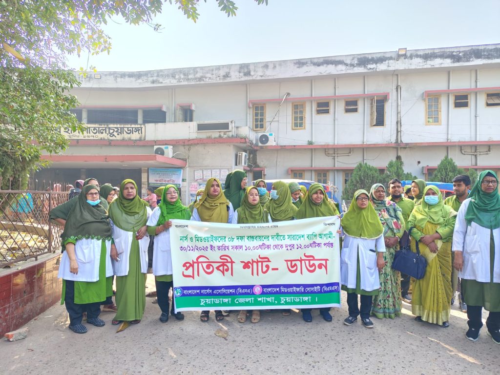 আট দফা বাস্তবায়নের দাবীতে দুই ঘন্টা প্রতিকী শাট- ডাউন পালন করেছে চুয়াডাঙ্গার সদর হাসপাতালে কর্মরত নার্সরা। গতকাল রবিবার সদর হাসপাতালের প্রধান ফটকে সকাল ১০ টা থেকে বেলা ১২ টা পর্যন্ত চলে তাদের এ কর্মসুচি। নার্স ও মিডওয়াইফদের ৮ দফা দাবিতে এ কর্মসুচি পালন করেন তারা। শাট- ডাউনের কারণে হাসপাতালে চিকিৎসা সেবা নিতে এসে রোগী স্বজনদের দুর্ভোগ পোহাতে দেখা যায়।