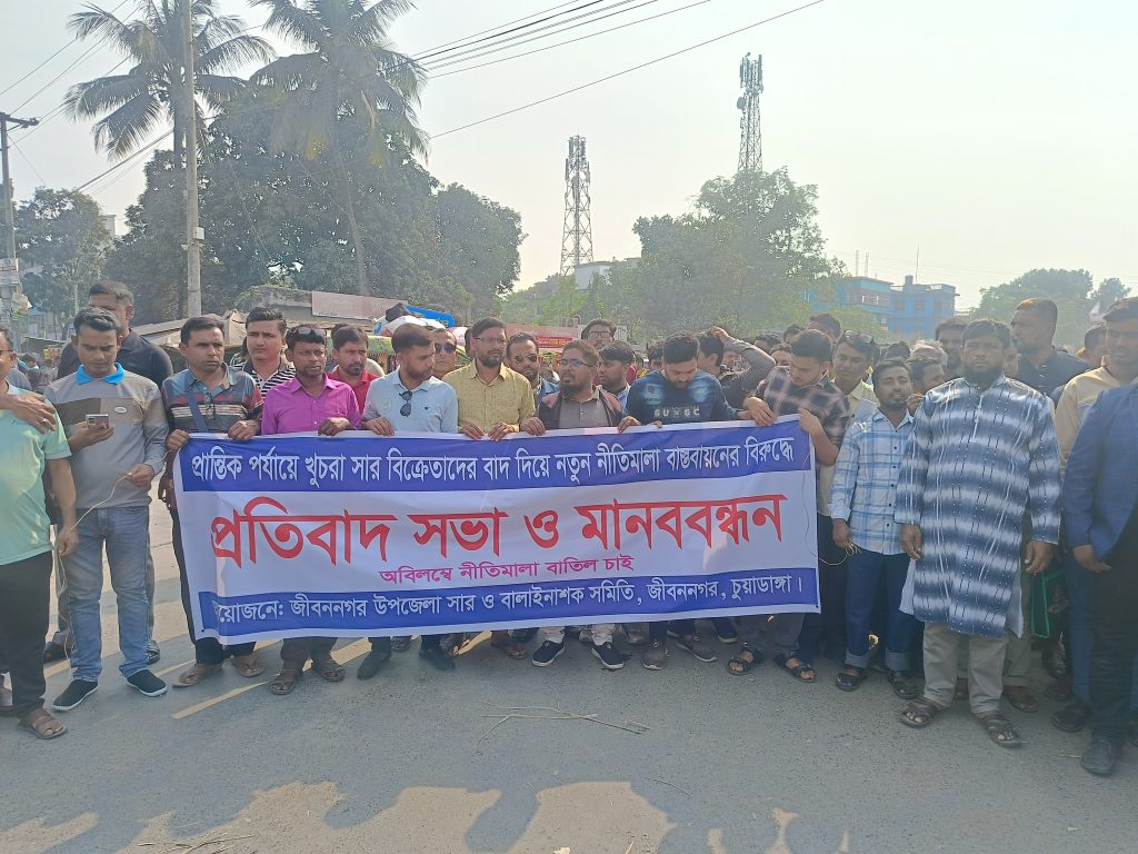 প্রান্তিক পর্যায়ে খুচরা সার বিক্রেতাদের বাদ দিয়ে নতুন সার ডিলার নিয়োগে নতুন নীতিমালা বাস্তবায়নের বিরুদ্ধে প্রতিবাদ ও মানববন্ধন করেছেন চুয়াডাঙ্গার জীবননগর উপজেলার খুচরা সার ব্যবসায়ীরা।