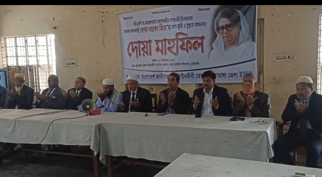 চুয়াডাঙ্গায় বিএনপির চেয়ারপার্সন ও সাবেক প্রধানমন্ত্রী বেগম খালেদা জিয়ার রোগমুক্তি এবং সুস্থতা কমনায় দোয়া মাহফিল অনুষ্ঠিত হয়েছে। মঙ্গলবার দুপুরে জেলা আইনজীবী সমিতি মিলনায়তনে জাতীয়তাবাদী আইনজীবী ফোরামের উদ্যোগে এ দোয়া মাহফিল অনুষ্ঠিত হয়।