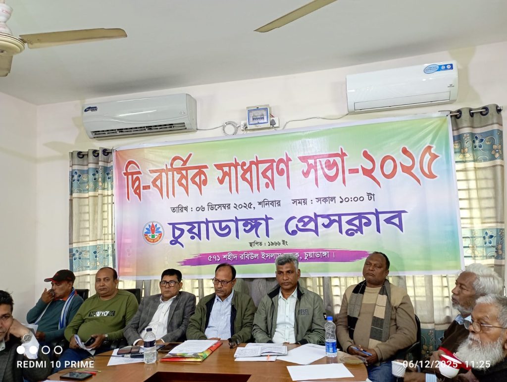 চুয়াডাঙ্গা প্রেসক্লাবে দ্বি-বার্ষিক সাধারণ সভা অনুষ্ঠিত হয়েছে। গতকাল শনিবার সকাল সাড়ে ১০ টায় প্রেসক্লাব মিলনায়তনে ওই সভা অনুষ্ঠিত হয়। এতে সভাপতিত্ব করেন চুয়াডাঙ্গা প্রেসক্লাবের সভাপতি রাজিব হাসান কচি। সভার শুরুতে প্রয়াত সদস্য ও দাতা সদস্যদের আত্মার শান্তির জন্য ১ মিনিট নীরবতা পালন করা হয়। পরে তাদের আত্মার মাগফেরাত কামনায় দোয়া অনুষ্ঠিত হয়। দোয়া পরিচালনা করেন প্রেসক্লাব সদস্য এফএ আলমগীর। পরে পূর্বের সভার কার্যবিবরণী পাঠ করেন দপ্তর সম্পাদক আবুল হাশেম। সকল সদস্যের সম্মতিক্রমে তা অনুমোদন করা হয়। প্রেসক্লাবের সাধারণ সম্পাদক বিপুল আশরাফ তার প্রতিবেদন পাঠ করেন এবং সম্মতিক্রমে তা অনুমোদন করা হয়। এসময় অর্থ সম্পাদক আতিয়ার রহমান বার্ষিক আয় ব্যয়ের হিসাব পাঠ করেন এবং তা অনুমোদিত হয়।
