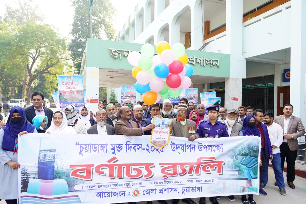 নানান আয়োজনের মধ্য দিয়ে ‘চুয়াডাঙ্গা মুক্ত দিবস ২০২৫’ উদযাপন করা হয়েছে। চুয়াডাঙ্গা জেলা প্রশাসন ও মুক্তিযোদ্ধা সংসদের আয়োজনে পালন করা হয়েছে এ দিবসটি। গতকাল শনিবার সকাল ৭ টায় মুক্তিযোদ্ধা সংসদ ও জেলা প্রশাসনের পক্ষ থেকে চুয়াডাঙ্গা শহীদ বেদীতে পুষ্পমাল্য অর্পণ করা হয়। পরে সকাল সাড়ে নয়টায় জেলা প্রশাসকের কার্যালয় থেকে একটি বর্ণাঢ্য র্যালি বের করা হয়। র্যালিটি শহরের প্রধান সড়ক প্রদক্ষিণ শেষে একই স্থানে এসে শেষ হয়। এরপর জেলা প্রশাসকের কার্যালয়ের সম্মেলন কক্ষে এক আলোচনা সভা অনুষ্ঠিত হয়। আলোচনা সভায় প্রধান অতিথি হিসেবে উপস্থিত ছিলেন জেলা প্রশাসক মোহাম্মদ কামাল হোসেন।