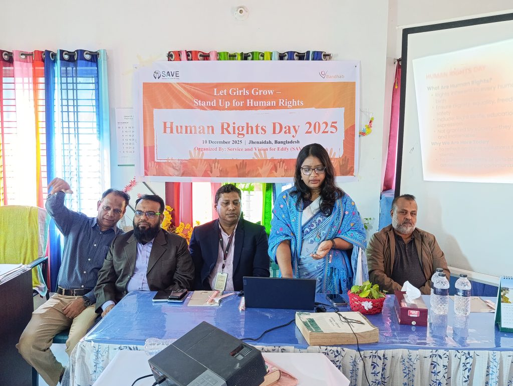 “মেয়েদের বড় হতে দিন, মানবাধিকারের পক্ষে দাঁড়াও” স্লোগানে ঝিনাইদহে মানবাধিকার দিবস পালিত হয়েছে। জেলার বেসরকারি সংস্থা সারভিস এন্ড ভিশন ফর এডিফাই (সেইভ) কার্যালয়ে এ উপলক্ষে সচেতনতা বৃদ্ধিতে অবহিতকরণ সভা অনুষ্ঠিত হয়। বুধবার সকাল ১০টায় জেলা শহরের পাবলিক লাইব্রেরির পদ্মা ট্রেনিং সেন্টারের সম্মেলন কক্ষে এ অনুষ্ঠানের আয়োজন করা হয়।