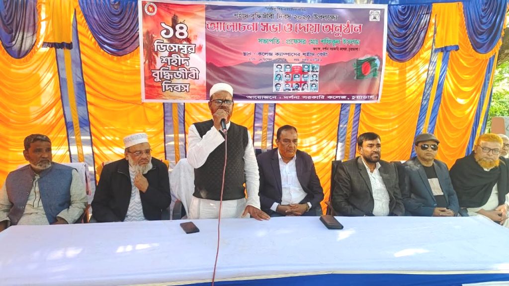 অন্যদিকে শহীদ বুদ্ধিজীবীদের স্মরণে পুষ্পস্তবক অর্পণ ও আলোচনা সভা অনুষ্ঠিত হয়। আলোচনা সভায় সভাপতিত্ব করেন দর্শনা সরকারি কলেজের অধ্যক্ষ শফিকুর ইসলাম। তিনি বলেন, শহীদ বুদ্ধিজীবী হত্যাকাণ্ড ছিল বাংলাদেশকে মেধাশূন্য করার গভীর ষড়যন্ত্র। জাতির শ্রেষ্ঠ সন্তানদের আত্মত্যাগ আমাদের আলোকিত ভবিষ্যতের পথ দেখায়।