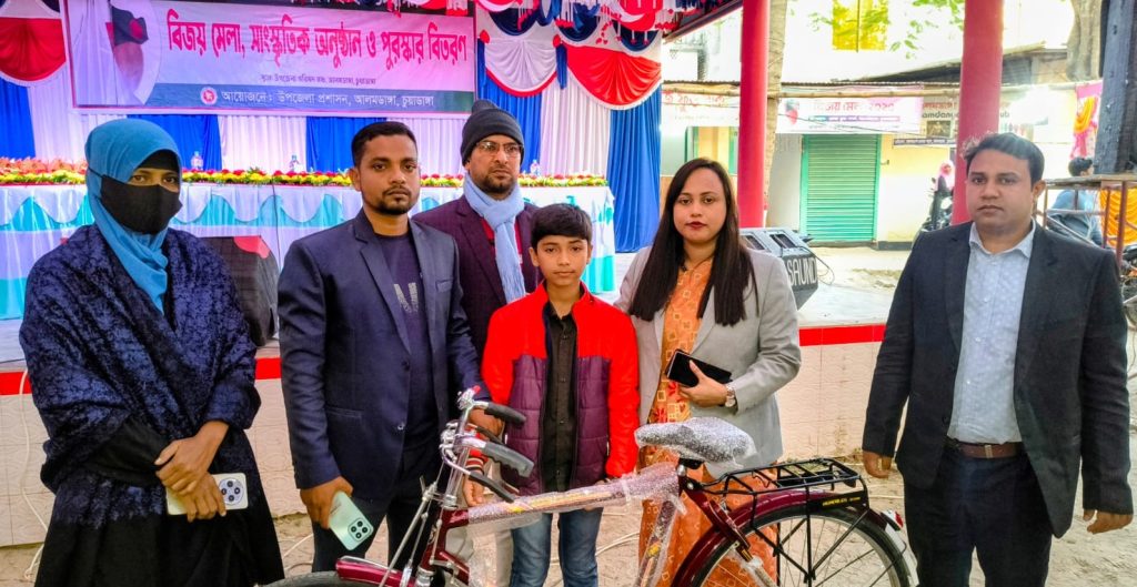 মানবাধিকার কর্মীদের প্রচেষ্টাই মানবিকতায় অনন্য দৃষ্টান্ত স্থাপন করে আলমডাঙ্গা উপজেলা নির্বাহী অফিসার পান্না আক্তার। অশ্রু ভেজা চোখ দেখে সন্তান সমতুল্য তুষারের পাশে অভিভাবকের ন্যায় দাঁড়ান। গতকাল বৃহস্পতিবার বিকালে বিজয় দিবসের শুভক্ষণে উপহার হিসেবে আলমডাঙ্গা উপজেলা মঞ্চে বিজয় মেলায় তুষারের হাতে তুলে দেন একটি নতুন সাইকেল। মুহূর্তেই কান্নাভেজা চোখে ফুটে ওঠে আনন্দের ঝিলিক হারানো হাসি ফিরে পায় তুষার।