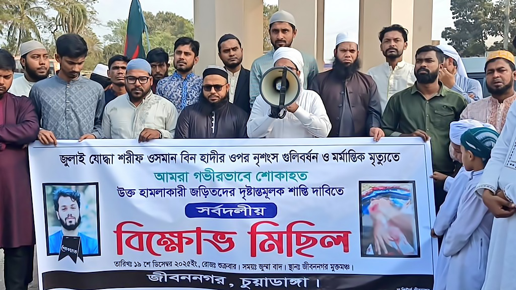 জুলাই আন্দোলনের অন্যতম সাহসী কণ্ঠস্বর, ইনকিলাব মঞ্চের মুখপাত্র শরিফ ওসমান হাদি হত্যাকাণ্ডে প্রত্যক্ষ ও পরোক্ষভাবে জড়িতদের দৃষ্টান্তমূলক শাস্তির দাবিতে চুয়াডাঙ্গার জীবননগরে সর্বদলীয় বিক্ষোভ সমাবেশ অনুষ্ঠিত হয়েছে। গতকাল শুক্রবার জুমার নামাজের পর জীবননগর বাসস্ট্যান্ড চত্বরে এ বিক্ষোভ সমাবেশ অনুষ্ঠিত হয়। বিক্ষোভ সমাবেশে বক্তব্য রাখেন জীবননগর উপজেলা খেলাফত মজলিসের সাধারণ সম্পাদক হাফেজ মাওলানা জুবায়ের আল মাহমুদ, উপজেলা স্বেচ্ছাসেবক দলের সদস্য সচিব ইখলাছুর রহমান রাসেল, উপজেলা ছাত্রদলের আহ্বায়ক জিল্লুর রহমান, উপজেলা বৈষম্যবিরোধী ছাত্র আন্দোলনের আহ্বায়ক সোহেল পারভেজ রাসেল, উপজেলা ছাত্রদলের যুগ্ম আহ্বায়ক গোলাম রব্বানী, জীবননগর ডিগ্রি কলেজ ছাত্রদলের সভাপতি সাব্বির হোসেন রিংকু, সাধারণ সম্পাদক ইমরান হোসেন ফরহাদ প্রমুখ।