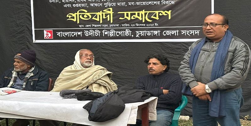 বাংলাদেশ উদীচী শিল্পীগোষ্ঠী চুয়াডাঙ্গা জেলা সংসদের উদ্যোগে গতকাল বিকেলে জেলা শিল্পকলা একাডেমি, চুয়াডাঙ্গা চত্বরে অবস্থিত উদীচী-চুয়াডাঙ্গা কার্যালয়ের সামনে এক প্রতিবাদী সমাবেশ অনুষ্ঠিত হয়। উদীচী-চুয়াডাঙ্গা’র সভাপতি হাবিবি জহির রায়হানের সভাপতিত্বে ও সাধারণ সম্পাদক আদিল হোসেনের সঞ্চালনায় সমাবেশে উদীচী, ছায়ানটসহ অন্যান্য সাংস্কৃতিক প্রতিষ্ঠান, প্রথম আলো, ডেইলি স্টারসহ বিভিন্ন ইলেকট্রনিক ও প্রিন্ট মিডিয়ার উপর হামলা, অগ্নিসংযোগ, লুটপাট ও ধ্বংস এবং সারাদেশে অব্যাহতভবাবে সংঘটিত গুপ্তহত্যা, আগুনে পুড়িয়ে মারা, মব-সন্ত্রাসের বিরুদ্ধে বক্তব্য রাখেন উদীচী-ঢাকা সহানগর সংসদের সদস্য শাওন কুমার রায়, চুয়াডাঙ্গা সাহিত্যচর্চা কেন্দ্র চর্চায়নের সদস্য কবি রিগ্যান এসকান্দার, চুয়াডাঙ্গা জেলা শিল্পীকল্যাণ পরিষদ সদস্য লিটু বিশ্বাস, বাংলাদেশ প্রগতি লেখক সংঘ চুয়াডাঙ্গা জেলা শাখার সাধারণ সম্পাদক কাজল মাহমুদ, সংলাপ সাংস্কৃতিক গোষ্ঠীর সভাপতি নজির আহমেদ, দৈনিক সময়ের সমীকরণ পত্রিকার প্রধান সম্পাদক নাজমুল হক স্বপন, প্রথম আলোর চুয়াডাঙ্গা প্রতিনিধি শাহ আলম সনি এবং অরিন্দম সাংস্কৃতিক সংগঠনের সভাপতি মো. আলাউদ্দীন।