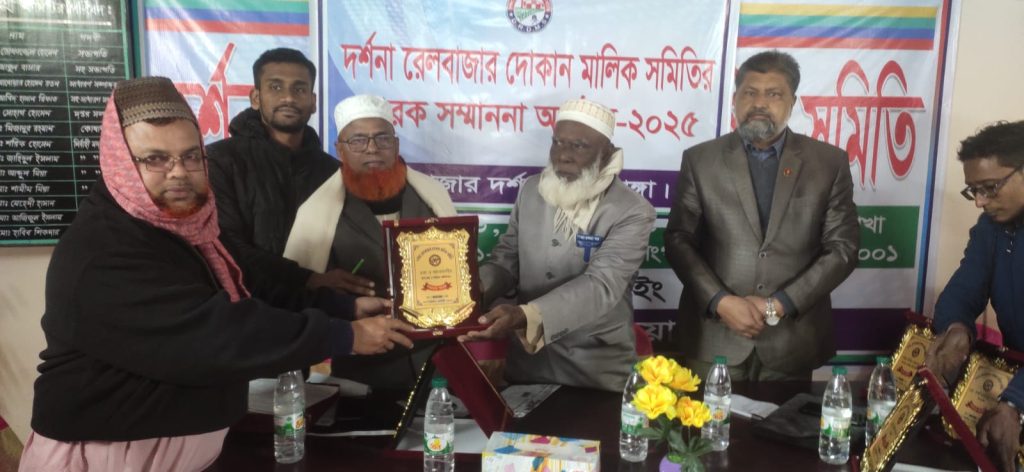 ঐতিহ্যবাহী দর্শনা রেলবাজার দোকান মালিক সমিতি কর্তৃক সদ্য সমাপ্ত নির্বাচন কার্যক্রম সুষ্ঠ, সর্বজন গ্রহণযোগ্য ও নিরপেক্ষভাবে সম্পাদন করায় নির্বাচন পরিচালনা পরিষদের সদস্যগনকে সন্মাননা প্রদান প্রদান করা হয়েছে। সন্ধা সাড়ে ৬টায় দর্শনা রেলবাজারস্থ দোকান মালিক সমিতির নতুন কার্যালয়ে সুধিবৃ›েদ্বর উপস্থিতিতে এই সন্মাননা প্রদান করা হয়। দর্শনা রেলবাজার দোকান মালিক সমিতির সভাপতি মোঃ তোফাজ্জেল হোসেনের সভাপতিত্বে অনুষ্ঠিত উক্ত সন্মাননা সভায় অন্যান্যের মধ্যে বক্তব্য রাখেন- প্রধান নির্বাচন কমিশনার প্রফেসর আজিজুর রহমান, জেলা জামায়াতের সহকারী সেক্রেটারি আব্দুল কাদের, জেলা শ্রমিক দলের সাধারণ স¤পাদক শফিকুল ইসলাম সাবু, বৈষম্য বিরোধী ছাত্র আন্দোলনের জেলা আহবায়ক তানভীর রহমান অনিক, কেরু এ্যান্ড কো¤পানির জিএম ফাইনান্স আব্দুস সাত্তার, দর্শনা পৌর বিএনপির সমন্বয়ক ও দোকান মালিক সমিতির সাবেক সভাপতি হাজী শওকত আলী, পৌর বিএনপির সমন্বয়ক মোঃ মশিউর রহমান, পুরাতন বাজার দোকান মালিক সমিতির সভাপতি মাহাবুবুল হক খোকন, দোকান মালিক সমিতির সেক্রেটারী হাজী আনোয়ার হোসেন রতন ও নির্বাচন পরিচালনা পরিষদের সদস্য সচিব সাংবাদিক জাহিদুল ইসলাম প্রমুখ।