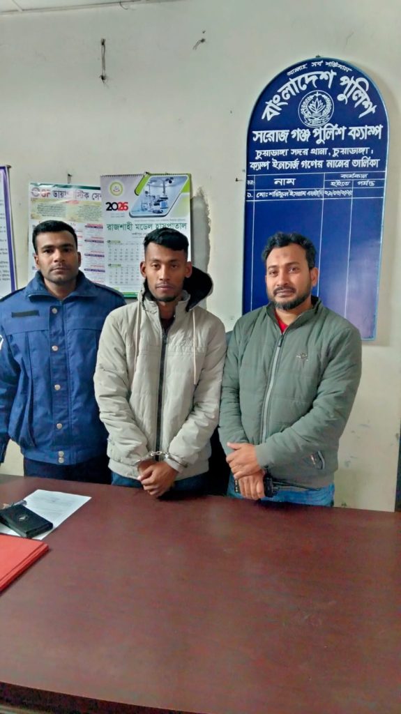 সরোজগঞ্জ পুলিশ ক্যাম্পের অভিযানে ওয়ারেন্টভুক্ত আসামি বোয়ালিয়া গ্রামের সাকিব (২৩) কে গ্রেফতার করেছে পুলিশ। গ্রেফতারকৃত সাকিব চুয়াডাঙ্গা সদর উপজেলার কুতুবপুর ইউনিয়নের বোয়ালিয়া গ্রামের শাহিন আলীর ছেলে।