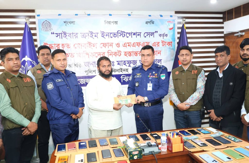 ঝিনাইদহ জেলা পুলিশের সাইবার ক্রাইম ইনভেস্টিগেশন সেলের উদ্যোগে হারিয়ে যাওয়া ৮৬টি মোবাইল ফোন এবং মোবাইল ফাইন্যান্সিয়াল সার্ভিস (এমএফএস)-এর মাধ্যমে প্রতারণায় হাতিয়ে নেওয়া ৯০ হাজার ৫ টাকা উদ্ধার করে প্রকৃত মালিকদের কাছে হস্তান্তর করা হয়েছে।