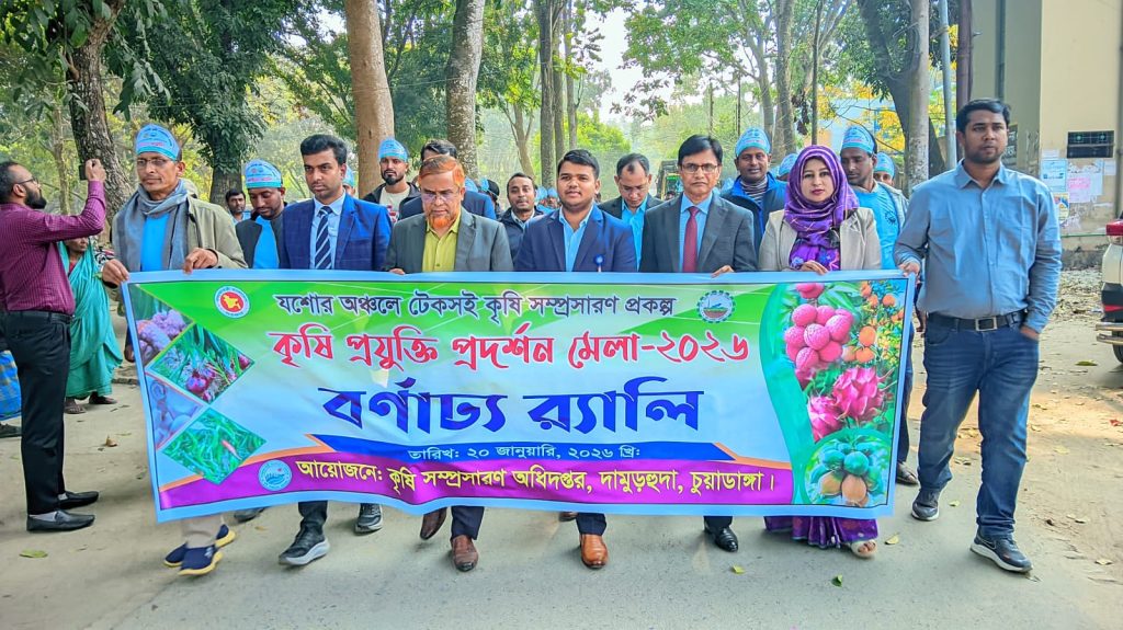 যশোর অঞ্চলে টেকসই কৃষি সম্প্রসারণ প্রকল্পের আওতায় ‘কৃষি প্রযুক্তি প্রদর্শন মেলা-২০২৬’ উপলক্ষে দামুড়হুদায় তিন দিনব্যাপী কৃষি মেলা শুরু হয়েছে। উপজেলা কৃষি সম্প্রসারণ অধিদপ্তরের আয়োজনে উপজেলা পরিষদ চত্বরে এ মেলার আয়োজন করা হয়।