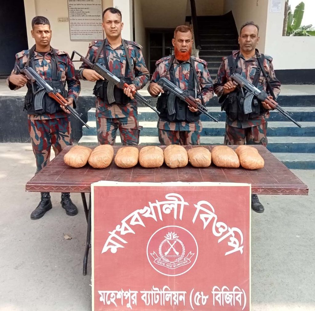 ৫৮-বিজিবির সহকারী পরিচালক মুন্সী ইমদাদুর রহমান জানান, গতকাল শনিবার বেলা পৌনে ২টার দিকে জীবননগর উপজেলার মাধবখালী বিওপি’র সীমান্ত পিলার-৭১/২-এস এর নিকট মাধবখালী গ্রামে নায়েক সুবেবার মোঃ হাবিবুর রহমান এর নেতৃত্বে মাদক বিরোধী অভিযান পরিচালনা করে আসামীবিহীন ৮ কেজি গাঁজা উদ্ধার করা হয়।