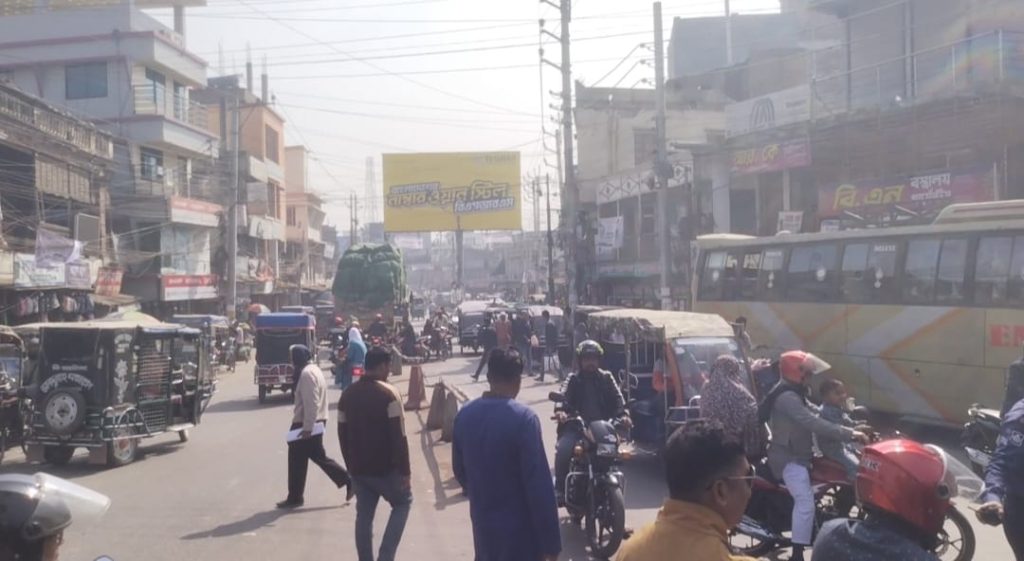 বড়বাজার হাসান চত্বর (চার রাস্তার মোড়) অনিয়ন্ত্রিত ইজিবাইক চলাচল, অবৈধ পার্কিং এবং ফুটপাত দখলের কারণে গুরুত্বপূর্ণ এই মোড়টি কার্যত অচল হয়ে পড়ছে। অন্যদিকে একাডেমির মোড়ে ফ্লাইওভার নির্মাণের কারণে সড়কের একটি অংশ বন্ধ থাকায় যান চলাচল মারাত্মকভাবে ব্যাহত হচ্ছে। এতে প্রতিদিন ভোগান্তিতে পড়ছেন পথচারী, ব্যবসায়ী, শিক্ষার্থী ও যানবাহন চালকরা।