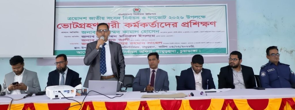 আসন্ন ত্রয়োদশ জাতীয় সংসদ নির্বাচন ও গণভোট-২০২৬ অবাধ, সুষ্ঠু ও নিরপেক্ষভাবে সম্পন্ন করার লক্ষ্যে চুয়াডাঙ্গার দামুড়হুদা উপজেলায় ভোটগ্রহণ কর্মকর্তাদের দিনব্যাপী বিশেষ প্রশিক্ষণ কর্মশালা অনুষ্ঠিত হয়েছে। শুক্রবার (৬ ফেব্রুয়ারি) বিকেল সাড়ে ৩টায় দামুড়হুদা শিল্পকলা একাডেমি অডিটোরিয়ামে উপজেলা নির্বাচন অফিসের আয়োজনে এ কর্মশালা অনুষ্ঠিত হয়।