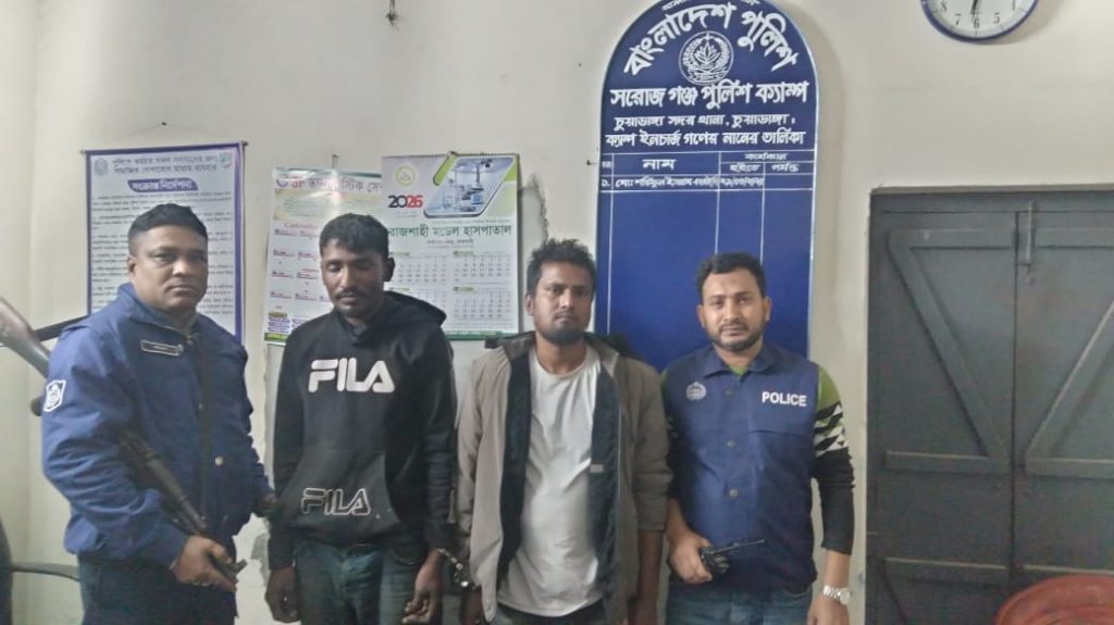 পুলিশ সূত্রে জানা গেছে, গত শনিবার রাত সাড়ে ১০টার দিকে সরোজগঞ্জ পুলিশ ফাঁড়ির ইনচার্জ এসআই শরিফুল ইসলামের সার্বিক তত্ত্বাবধানে এএসআই ওহিদুল ইসলাম ও এএসআই সদরুল আলম সঙ্গীয় ফোর্স নিয়ে সরোজগঞ্জ বাজার এলাকায় রাত্রিকালীন ডিউটি পালন করছিলেন। এসময় গোপন সংবাদের ভিত্তিতে অভিযান পরিচালনা করে সরোজগঞ্জ উচ্চ বিদ্যালয় মাঠ এলাকা থেকে দুইজনকে আটক করা হয়। পরে তাদের দেহ তল্লাশি করে ৩০ পিস ট্যাপেন্ডাডল ট্যাবলেট উদ্ধার করে পুলিশ। আটকদের বিরুদ্ধে প্রয়োজনীয় আইনানুগ ব্যবস্থা গ্রহণ শেষে রাতেই চুয়াডাঙ্গা সদর থানায় সোপর্দ করা হয়েছে বলে পুলিশ জানিয়েছে।