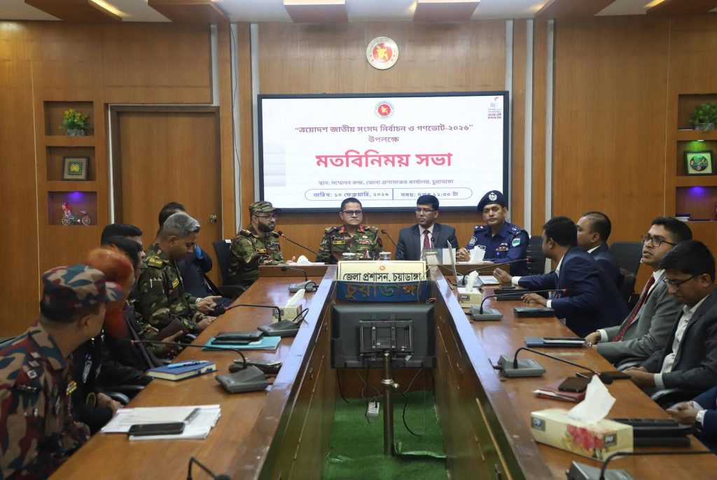 চুয়াডাঙ্গায় ত্রয়োদশ জাতীয় সংসদ নির্বাচন ও গণভোট সুষ্ঠু, অবাধ, নিরপেক্ষ ও শান্তিপূর্ণভাবে সম্পাদনের লক্ষ্যে জেলা প্রশাসনের পক্ষ থেকে আইন-শৃংখলা রক্ষা ও যান চলাচল নির্বিঘ্ন রাখার জন্য প্রয়োজনীয় ব্যবস্থা গ্রহন করা হয়েছে। গতকাল মঙ্গলবার চুয়াডাঙ্গা জেলা প্রশাসক ও রিটার্নিং অফিসার মোহাম্মদ কামাল হোসেন স্বাক্ষরিত এক গণবিজ্ঞপ্তিতে এ তথ্য জানানো হয়েছে।