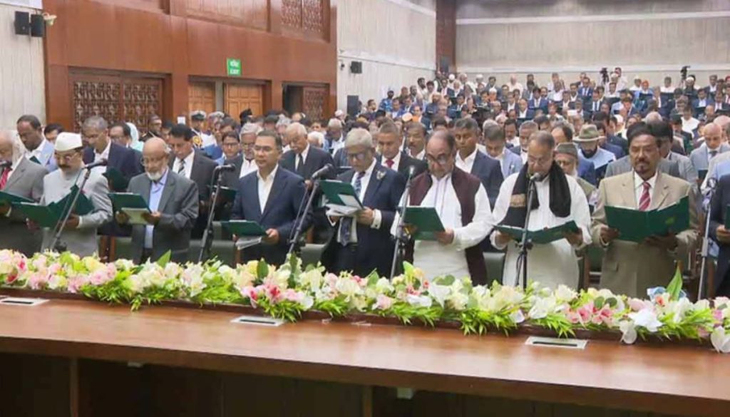 রেওয়াজ অনুযায়ী, সংখ্যাগরিষ্ঠ দল হিসেবে বিএনপির নির্বাচিতদের শপথই আগে পড়ানো হলো।