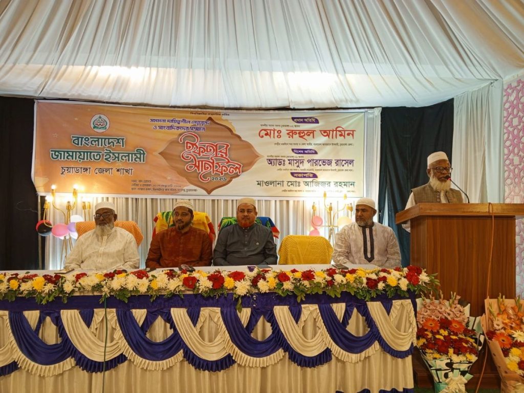 চুয়াডাঙ্গা চেম্বার ভবনে এ ইফতার মাহফিলে সভাপতিত্ব করেন জেলা জামায়াতের নায়েবে আমির মাওলানা আজিজুর রহমান। জামায়াতের জেলা সেক্রেটারি অ্যাড. আসাদুজ্জামানের উপস্থাপনায় অনুষ্ঠিত ইফতার মাহফিলে প্রধান অতিথির বক্তব্যে চুয়াডাঙ্গা ২ আসনের সংসদ সদস্য ও জেলা জামায়াতের আমির মো. রুহুল আমিন বলেন, চুয়াডাঙ্গাবাসী ভোটের মাধ্যমে যে দায়িত্ব অর্পণ করেছেন, তা যথাযথভাবে পালনে তিনি সবার সহযোগিতা চান। নির্বাচনের আগে দেওয়া প্রতিশ্রুতিগুলো বাস্তবায়নে আন্তরিকতার সঙ্গে কাজ করার অঙ্গীকার করেন তিনি। সরকারি সুযোগ-সুবিধা যেমন বাড়ি, গাড়ি বা ফ্ল্যাট গ্রহণ করবেন না বলেও জানান। পাশাপাশি জেলার হাসপাতাল, ক্লিনিক, শিক্ষাপ্রতিষ্ঠান, বাস টার্মিনাল ও গুরুত্বপূর্ণ স্থাপনা পরিষ্কার-পরিচ্ছন্ন রাখতে শিগগিরই কর্মসূচি গ্রহণের কথা জানান। খুব শিগগির প্রশাসনের কর্মকর্তাদের সঙ্গে বৈঠকে বসে সমন্বিতভাবে কাজ শুরুর কথাও উল্লেখ করেন তিনি। বৈষম্যহীন ও নিরাপদ সমাজ গঠনে সকলের ঐক্যবদ্ধ সহযোগিতা কামনা করেন।