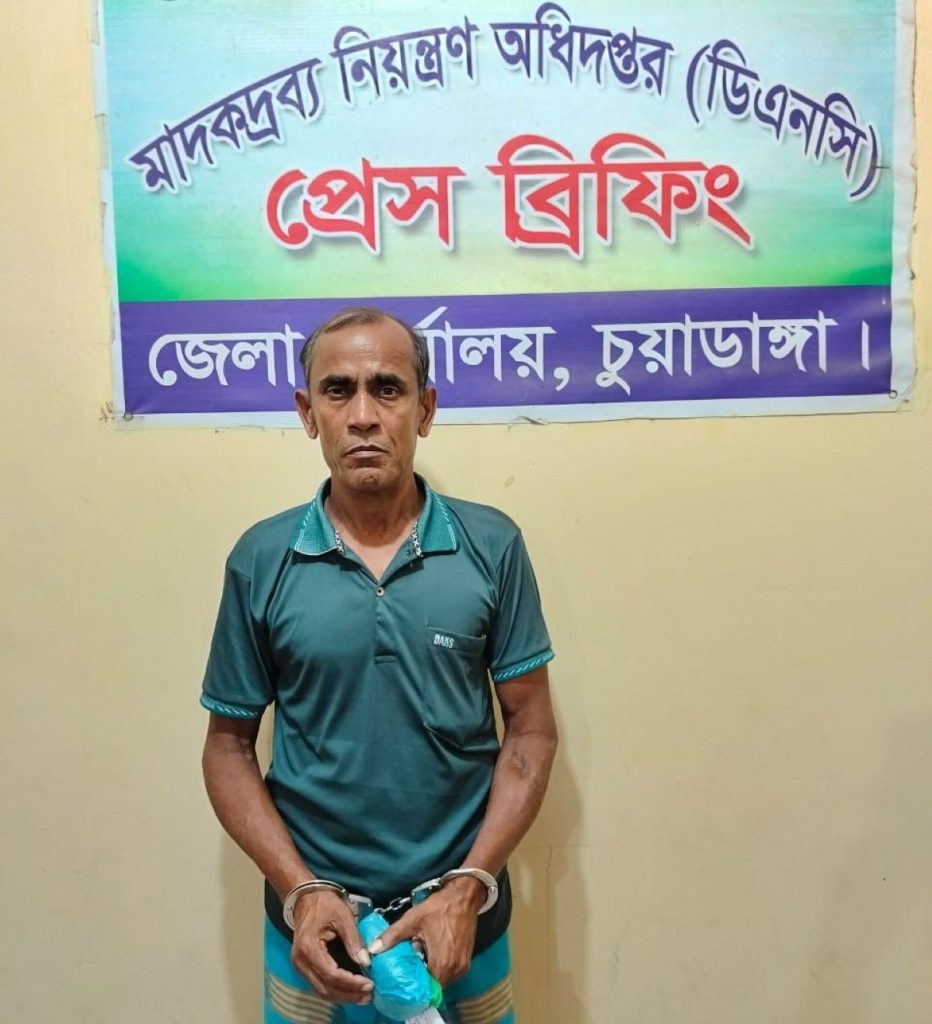করা হয়েছে। গতকাল সোমবার দুপুর সাড়ে ১২ টার দিকে জেলা মাদকদ্রব্য নিয়ন্ত্রণ অধিদপ্তর এ অভিযান পরিচালনা করেন। গ্রেফতাকৃত আসামী আবু সিদ্দিক (৫১) দামুড়হুদা উপজেলার ফকির পাড়া গ্রামের গফুর মণ্ডলের ছেলে।