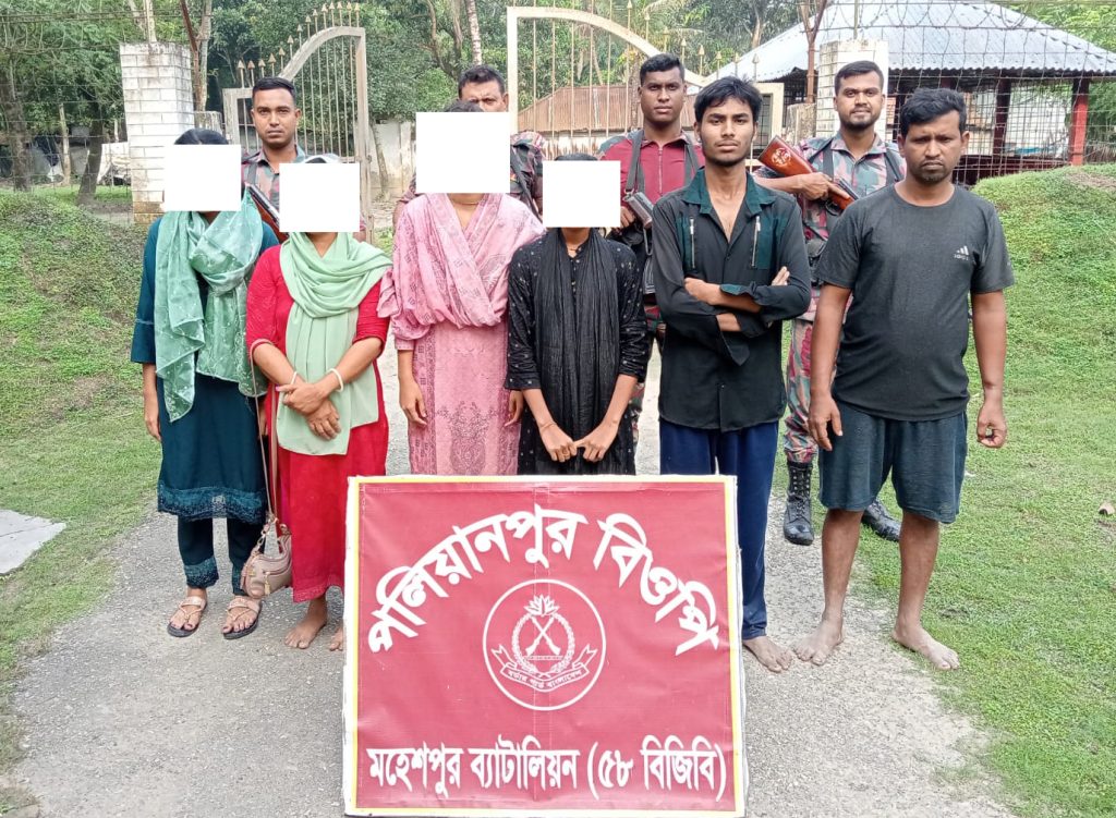 অপরদিকে গতকাল ভোর রাত সাড়ে ৩টার দিকে জীবননগর বেনীপুর বিওপি’র সীমান্ত পিলার ৬১/৪-এস হতে ২০০ গজ বাংলাদেশের অভ্যন্তরে বেনীপুর বিত্তিপাড়া গ্রামের মো: রফিকুল ইসলামের সবজি বাগানে নায়েব সুবেদার মোঃ উবায়দুল্লাহর নেতৃত্বে নিয়মিত টহল পরিচালনা করে। এ সময় অবৈধভাবে বাংলাদেশ হতে ভারতে যাওয়ার সময়  ৩ জনকে আটক করা হয়। এর মধ্যে ১ জন পুরুষ, ১ নারী ও ১ জন শিশু রয়েছে। আটক পুরুষের নাম  নিপুন সমাদ্দার (৩৮)। বাড়ী গোপালগঞ্জ জেলার গান্দিয়ারশুর গ্রামে। একই দিন বেলা সাড়ে ১১টার দিকে বাঘাডাংগা বিওপি’র সীমান্ত পিলার ৬০/৭৪-আর হতে ৫০ গজ বাংলাদেশের অভ্যন্তরে বাঘাডাংগা হুদাপাড়া গ্রামের মোঃ মহিমের বাড়ীর সামনে হতে সুবেদার মোঃ আতিয়ার রহমানের নেতৃত্বে নিয়মিত টহল পরিচালনা করে। এ সময় অবৈধভাবে বাংলাদেশ হতে ভারতে যাওয়ার চেষ্টাকালে  ১ জন (নারী) বাংলাদেশী নাগরিক আটক করা হয়। একই দিন সকাল সাড়ে ৭টার দিকে পলিয়ানপুর বিওপি’র সীমান্ত পিলার ৬০/২৬-আর হতে ৫০০ গজ বাংলাদেশের অভ্যন্তরে কাজিরবেড় গ্রামের মোঃ আলী হোসেনের চায়ের দোকানের সামনে নায়েব সুবেদার মোঃ ফারুক হোসেনের নেতৃত্বে টহল পরিচালনা করে। এ সময়  অবৈধভাবে বাংলাদেশ হতে ভারতে যাওয়ার সময় ৬ জনকে আটক করা হয়। এর মধ্যে পুরুষ ২ জন, নারী ৩ জন ও শিশু ১ জন। আটক পুরুষ সদস্যরা হলো  গোপালগঞ্জ জেলার পুকুরিয়া গ্রামের নির্মল বিশ্বাস (৩৬) ও নারায়নগঞ্জ জেলার কাচারি পল্লি গ্রামের মোহাম্মদ সাজু (২২)।