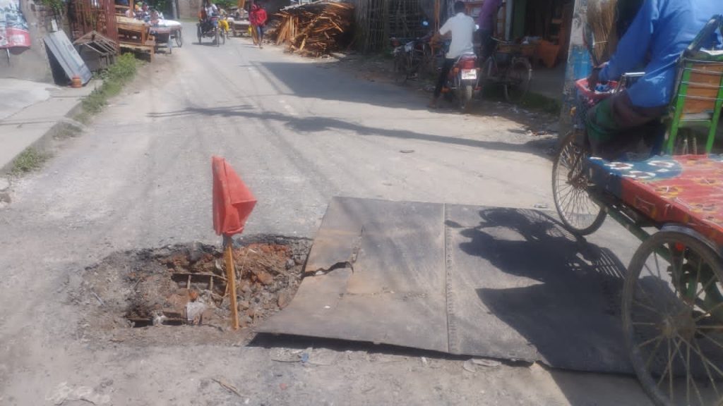আলমডাঙ্গার হাটবোয়ালিয়া-বামুন্দী সড়কের ড্রেনের বক্স কালভার্টটি দেবে গিয়ে বড় গর্তের সৃষ্টি