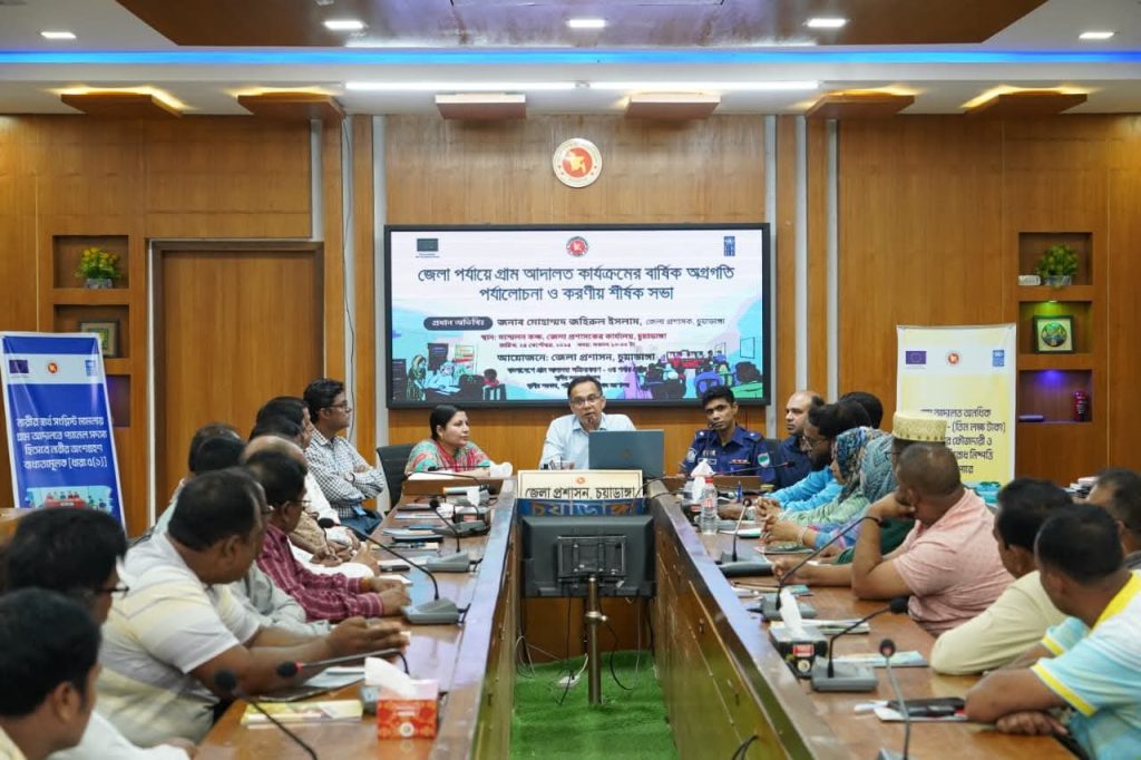আলোচনায় অংশগ্রহণকারীরা গ্রাম আদালত কার্যক্রমের গুরুত্ব, এ পর্যন্ত অর্জিত অগ্রগতি, বিদ্যমান চ্যালেঞ্জ ও ভবিষ্যৎ করণীয় বিষয়ে মতামত প্রদান করেন। সভায় বক্তারা গ্রামীণ জনগণের সহজ, সাশ্রয়ী ও দ্রুত ন্যায়বিচার প্রাপ্তির ক্ষেত্রে গ্রাম আদালতের কার্যক্রমকে আরও ফলপ্রসূ করার ওপর গুরুত্ব আরোপ করেন। এ কার্যক্রমকে জনগণের কাছে আরও কার্যকরভাবে পৌঁছে দিতে সমন্বিত প্রচেষ্টার প্রয়োজনীয়তা তুলে ধরেন। সভায় জেলা প্রশাসনের ঊর্ধ্বতন কর্মকর্তাবৃন্দ, চুয়াডাঙ্গা জেলার পুলিশ সুপারের প্রতিনিধি, জাতিসংঘ উন্নয়ন কর্মসূচি (ইউএনডিপি)-এর প্রতিনিধি, জেলা রিসোর্স টিমের সদস্যবৃন্দ, জেলার সকল ইউনিয়নের চেয়ারম্যান ও প্রশাসকবৃন্দ, ওয়েভ ফাউন্ডেশনের প্রতিনিধিবৃন্দ উপস্থিত ছিলেন।