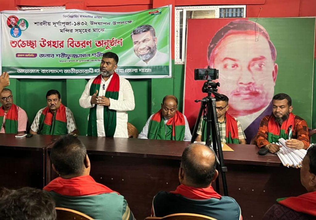 বাংলাদেশ পূজা উদযাপন পরিষদের জেলা আহ্বায়ক সুরেশ কুমার আগরওলার সভাপতিত্বে অনুষ্ঠানে প্রধান অতিথি ছিলেন জেলা বিএনপির সাধারণ সম্পাদক শরীফুজ্জামান শরীফ। প্রধান অতিথি বলেন, ‘শারদীয় দুর্গাপূজা শুধু হিন্দু সম্প্রদায়ের নয়, বরং এটি আমাদের সামগ্রিক জাতীয় সংস্কৃতির একটি গুরুত্বপূর্ণ অংশ। এই উৎসবকে ঘিরে সম্প্রীতি, ভালোবাসা এবং ভ্রাতৃত্ববোধ আরও সুদৃঢ় হয়। তাই আমরা মনে করি, প্রতিটি ধর্মীয় অনুষ্ঠানই আমাদের জাতীয় ঐক্যের প্রতীক।’ ‘আমরা সবাই বাংলাদেশি, এটাই আমাদের মূল পরিচয়। ধর্ম, বর্ণ বা রাজনৈতিক মতপার্থক্য দিয়ে আমাদের বিভক্ত হওয়া উচিত নয়। দেশ ও সমাজের স্বার্থে সকলকে এক হয়ে কাজ করতে হবে। এই আয়োজন যেন নির্বিঘ্নে সম্পন্ন হয় সেজন্য জেলা প্রশাসন ও পুলিশ প্রশাসনের পাশাপাশি জেলা বিএনপির নেতাকর্মীরাও স্বেচ্ছাসেবক হিসেবে কাজ করবে। আমাদের লক্ষ্য হচ্ছে, উৎসবের আনন্দ যাতে প্রত্যেক মানুষ সমানভাবে উপভোগ করতে পারে।’