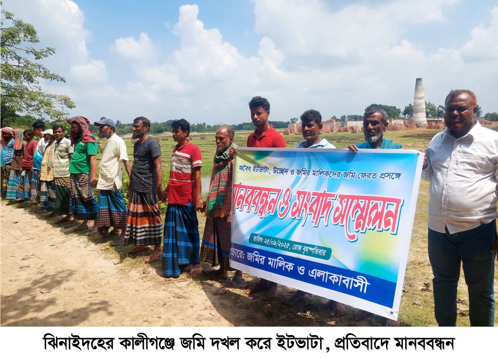 ঝিনাইদহের কালীগঞ্জ উপজেলার চাঁদপাড়া গ্রামে কৃষি জমি দখল করে ইটভাটা করার প্রতিবাদে মানববন্ধন করেছে এলাকাবাসী। বৃহস্পতিবার দুপুর ১২ টার দিকে চাঁদপাড়া এলাকার ওই ইটভাটার সামনে মানববন্ধন অনুষ্ঠিত হয়। প্রায় ঘন্টাব্যাপী চলা এ মানববন্ধনে বিভিন্ন শ্রেণি-পেশার মানুষ অংশগ্রহণ করেন। এ সময় বক্তব্য রাখেন চাঁদপাড়া গ্রামের জমির মালিক মফিজুর রহমান, আহম্মদ আলী, শুকুর আলী, সিরাজুল ইসলাম, জামির হোসেনসহ অন্যান্যরা।