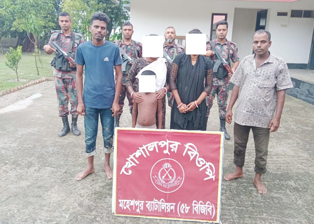এদিকে গতকাল সোমবার বেলা ১২ টার দিকে শ্রীনাথপুর বিওপি’র ৬০/১৫৮-আর এর কাছে সরিষাঘাটা বাজার নামক স্থান হতে নায়েক মোঃ সাইফুল ইসলাম এর নেতৃত্বে নিয়মিত টহল পরিচালনা করে। এ সময় অবৈধভাবে বাংলাদেশ হতে ভারতে যাওয়ার সময় ২ জন (নারী) বাংলাদেশী নাগরিক আটক করা হয়। একই দিন সকাল সাড়ে ৭টার দিকে খোসালপুর বিওপি’র সীমান্ত পিলার ৬০/৭৪-আর এর কাছে খোশালপুর গ্রামে হাবিলদার মোঃ নুরুজ্জামানের নেতৃত্বে নিয়মিত টহল পরিচালনা করে। এ সময় অবৈধভাবে বাংলাদেশ হতে ভারতে যাওয়ার চেষ্টাকালে ৫ জন বাংলাদেশী নাগরিক আটক করা হয়। এর মধ্যে ২ জন পুরুষ, ২ জন নারী ও ১ জন শিশু রয়েছে। আটককৃত পুরুষরা হলো যশোর জেলার চাউলিয়া গ্রামের মিলন দাস (৪৫) ও তারক দাস (২৪)।