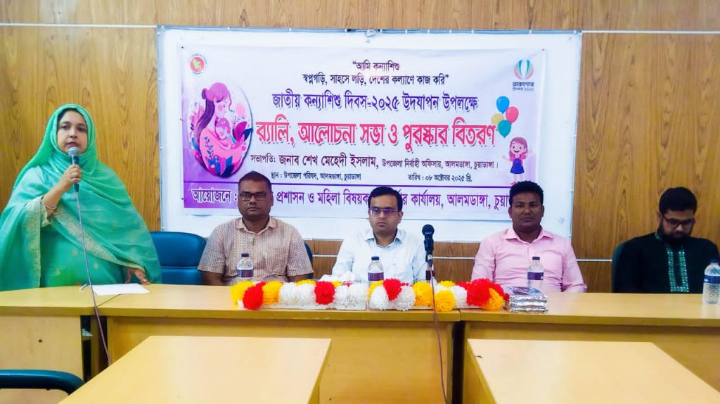 আলমডাঙ্গা অফিস জানিয়ে, ‘আমি কন্যা শিশু- স্বপ্ন গড়ি, সাহসে লড়ি, দেশের কল্যাণে কাজ কর’ -এই প্রতিপাদ্য নিয়ে আলমডাঙ্গায় জাতীয় কন্যা শিশু দিবস ২০২৫ পালিত হয়েছে। গতকাল বুধবার সকাল ১১টায় উপজেলা প্রশাসন ও উপজেলা মহিলা বিষয়ক কর্মকর্তার কার্যালয়ের আয়োজনে  এক বর্ণাঢ্য র‌্যালি বের হয়। র‌্যালিটি উপজেলা পরিষদ চত্বর থেকে বের হয়ে বিভিন্ন সড়ক প্রদক্ষিন করে আবার উপজেলা পরিষদ চত্বর এসে শেষ হয়। পরে উপজেলা পরিষদ মিলনায়তনে আলোচনা সভা অনুষ্ঠিত হয়। সভায় সভাপতিত্ব করেন উপজেলা নির্বাহী কর্মকর্তা শেখ মেহেদী ইসলাম। তিনি তার বক্তব্যে  বলেন, ‘আজকে সময় এসেছে আমাদের কন্যা শিশুদের সকল বৈষম্য দুর করে তাদের আগামীর ভবিষ্যতের উন্নয়ন অগ্রগতির  রাস্তা তৈরি করে দিতে হবে।  তিনি সকল কন্যা  শিশুর সাফল্য কামনা করেন।’