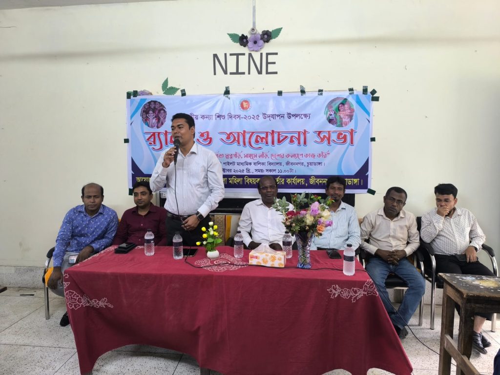‘আমি কণ্যাশিশু স্বপ্নগড়ি, সাহসে লড়ি, শের কল্যাণে কাজ করি’ এই প্রতিপ্যা বিষয়টিকে ধারণ করে চুয়াডাঙ্গায় জাতীয় কণ্যাশিশু দিবস-২০২৫ উদযাপন উপলক্ষে বর্ণাঢ্য র‌্যালী, আলোচনা সভা ও পুরস্কার বিতরণ অনুষ্ঠিত হয়েছে। চুয়াডাঙ্গা জেলা প্রশাসন ও মহিলা বিষয়ক অধিদপ্তর দিবসটির আয়োজন করে। দিবসটি উপলক্ষে গতকাল বুধবার সকাল ১০ টায় জেলা প্রশাসকের কার্যালয়ের সামনে থেকে একটি বর্ণাঢ্য র‌্যালী বের করা হয়। র‌্যালীটি শহরের গুরুত্বপূর্ণ সড়ক প্রদক্ষিণ শেষে একই স্থানে গিয়ে সমাপ্তি হয়। পরে জেলা প্রশাসকের সম্মেলন কক্ষে আলোচনা সভা অনুষ্ঠিত হয়। সভায় সভায় সভাপতিত্ব করেন চুয়াডাঙ্গার অতিরিক্ত জেলা প্রশাসক (সার্বিক) আহমেদ মাহবুব উল ইসলাম। চুয়াডাঙ্গা মহিলা বিষয়ক অধিদপ্তরের ভারপ্রাপ্ত উপপরিচালক মাকসুরা জান্নাত স্বাগত বক্তব্য উপস্থাপন করেন। পরে তার  সঞ্চালনায় আলোচনা সভায় বিশেষ অতিথির বক্তব্য রাখেন অতিরিক্ত পুলিশ সুপার (সদর সার্কেল) মোস্তাফিজুর রহমান, চুয়াডাঙ্গা সরকারি কলেজের সাবেক অধ্যক্ষ প্রফেসর সিদ্দিকুর রহমান, চুয়াডাঙ্গা জেলা সমাজসেবা কার্যালয়ের উপপরিচালক সিদ্দিকা সোহেলী রশিদ।