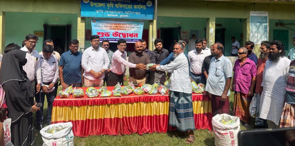 আলমডাঙ্গা উপজেলা কৃষি সম্প্রসারণ অধিদপ্তরের উদ্যোগে ২০২৫- ২৬ অর্থ বছরের রাজস্ব খাতে প্রণোদনা কর্মসূচির আওতায় ক্ষুদ্র ও প্রান্তিক কৃষকদের মাঝে বিনামূল্যে বীজও রাসায়নিক সার বিতরণের উদ্বোধন করা হয়েছে। বুধবার সকাল ১১ টার দিকে কৃষি অফিস চত্বরে আনুষ্ঠানিকভাবে শুভ উদ্বোধন করেন অনুষ্ঠানের প্রধান অতিথি উপজেলা নির্বাহী অফিসার শেখ মেহেদী ইসলাম। উপজেলা কৃষি অফিসার কৃষিবিদ মাসুদ হোসেন পলাশের সভাপতিত্বে বিশেষ অতিথি ছিলেন উপজেলা কৃষি সম্প্রসারণ অফিসার উদয় রহমান।