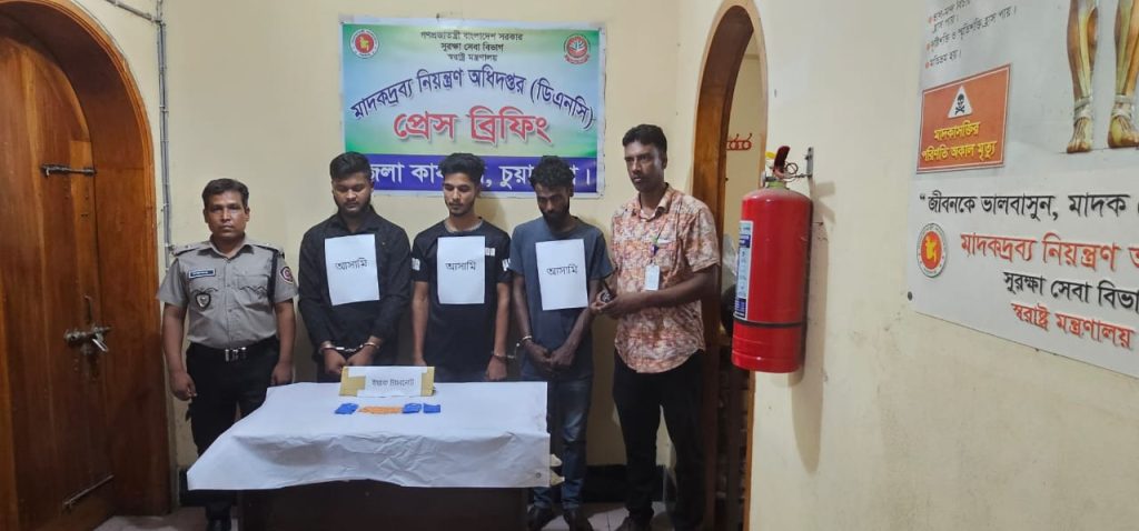 মাদকদ্রব্য নিয়ন্ত্রণ অধিদপ্তর এ অভিযান পরিচালনা করেন। গ্রেফতারকৃতরা হলো দামুড়হুদা উপজেলার দশমি গুলশান পাড়ার আনসার আলী মোল্লার ছেলে রাসেল মোল্লা পিন্টু (২৬), আসিকুর রহমান মিন্টুর ছেলে সবুজ (২৪) ও দামুড়হুদার দশমি পাড়ার তোফাজ্জল হোসেন মিন্টুর ছেলে জাহিদ হাসান (৩০)।