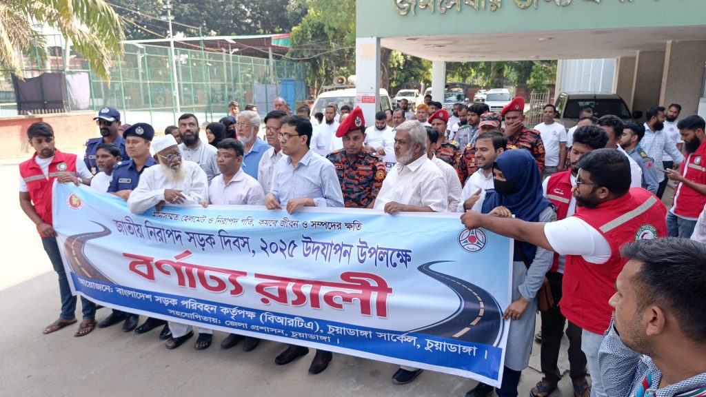 মানসম্মত হেলমেট ও নিরাপদ গতি, কমবে জীবন ও সম্পদের ক্ষতি’ এই প্রতিপাদ্যকে সামনে রেখে চুয়াডাঙ্গায় জাতীয় নিরাপদ সড়ক দিবস পালন করা হয়েছে। গতকাল বুধবার সকাল ১০টায় জেলা প্রশাসক কার্যালয় চত্বর থেকে দিবসটি উপলক্ষে র্যালি বের হয়ে শহরের গুরুত্ব পূর্ণ সড়ক প্রদক্ষিণ শেষে একই স্থানে এসে র্যালিটি শেষ হয়। এরপর দিবসটি উদযাপন উপলক্ষে জেলা প্রশাসকের সম্মেলন কক্ষে আলোচনা সভা অনুষ্ঠিত হয়। সভায় সভাপতিত্ব করেন অতিরিক্ত জেলা প্রশাসক (সার্বিক) আহমেদ মাহবুব-উল-ইসলাম। এসময় সভাটি আয়োজন করেন বাংলাদেশ সড়ক পরিবহন কর্তৃপক্ষ (বিআরটি) চুয়াডাঙ্গা সার্কেল। সভার শুরুতে সড়ক দুর্ঘটনায় আহত ও নিহতদের পাশে থেকে সরকার কাজ করছে। একই সাথে সড়কে চলাচলে নিয়ম শৃঙ্খলা বিষয়ে ভিডিও চিত্র প্রদর্শন করা হয়। এরপর সভায় স্বাগত বক্তব্য রাখেন বিআরটি চুয়াডাঙ্গা সার্কেলের সহকারী পরিচালক লিটন বিশ্বাস। এরপর সড়কের গতিপথ ও ট্রাফিক নিয়ম মেনে চলা এবং সড়ক দুর্ঘটনা কমে নিয়ে আসার বিভিন্ন বিষয় নিয়ে আলোচনা সভা করা হয়।
