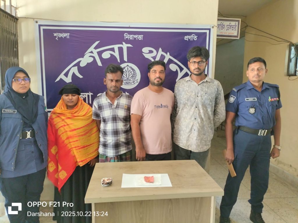দর্শনায় এক শিক্ষিকার বাড়িতে দিনের বেলায় সংঘটিত দুর্ধর্ষ চুরির রহস্য উন্মোচন করেছে পুলিশ। একের পর এক অভিযান চালিয়ে নারীসহ পাঁচজন চোরাকারবারিকে গ্রেফতার করা হয়েছে। এসময় উদ্ধার করা হয়েছে চুরি হয়ে যাওয়া দুইটি স্বর্ণের আংটি, যার ওজন প্রায় চার আনা।