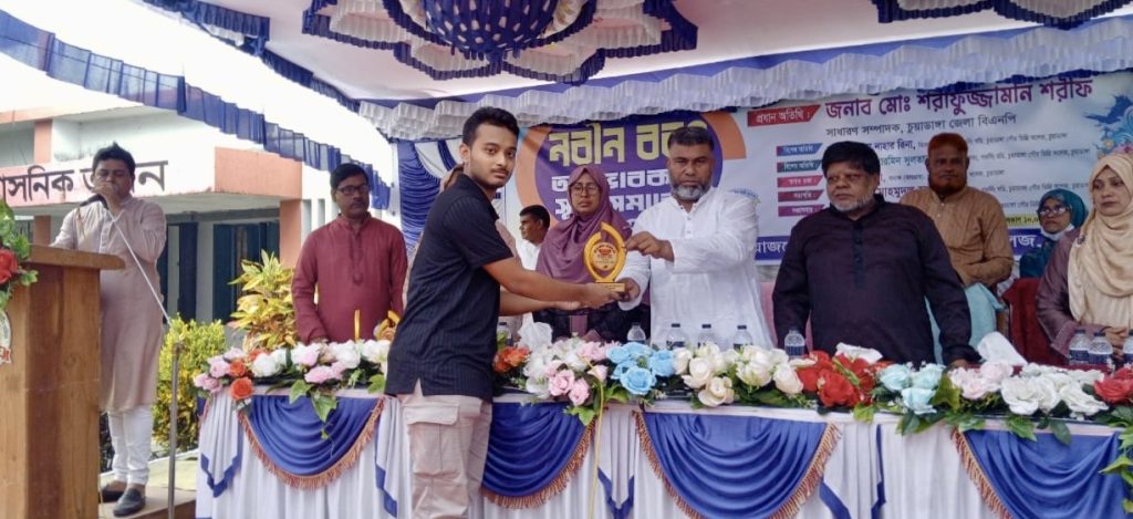 প্রধান অতিথি ছিলেন- চুয়াডাঙ্গা জেলা বিএনপির সাধারণ সম্পাদক শরীফুজ্জামান শরীফ। তিনি বলেন, আজকের নবীন শিক্ষার্থীরা যাদেরকে ফুল দিয়ে বরণ করে নিচ্ছি তারাই একদিন দেশগঠনে গুরুত্বপূর্ণ ভূমিকা পালন করবে। বিগত সময়গুলোতে শিক্ষা প্রতিষ্ঠানে দূর্ভাগ্যজনক ভাবে দূর্নীতি মাদক এবং ভীতিকর পরিবেশ সৃষ্টি করা হয়েছিল। আমাদেরকে শিক্ষার গুনগত মান বৃদ্ধির লক্ষ্যে কাজ করছে হবে। ব্যক্তিগত স্বার্থে কোনভাবেই বিভেদ তৈরি করা যাবে না, যাতে কলেজের পরিবেশ নষ্ট হয়। শিক্ষার্থীরা তোমারা প্রয়োজনে মোবাইল ব্যবহার করবা কিন্তু তা যেন আসক্তির পর্যায়ে না যায়।সময় পেলে বই পড়বা এবং ছেলেরা বিকালে খেলার মাঠে যাওয়ার অভ্যাস তৈরি করবা,তাতে শরীর মন দুটোই ভালো থাকবে। পরিছন্ন ক্যাম্পাস ও মেধা বিকাশই হোক একমাত্র লক্ষ্য। দূর্নীতি থাকলে তা শেকড় থেকে উৎপাটন করা এবং নতুন করে দূর্নীতির বীজ বপন করতে দেওয়া হবে না। কলেজের শিক্ষার্থীদের প্রয়োজনীয় সহযোগিতা আমার সাধ্য মত অব্যাহত থাকবে।