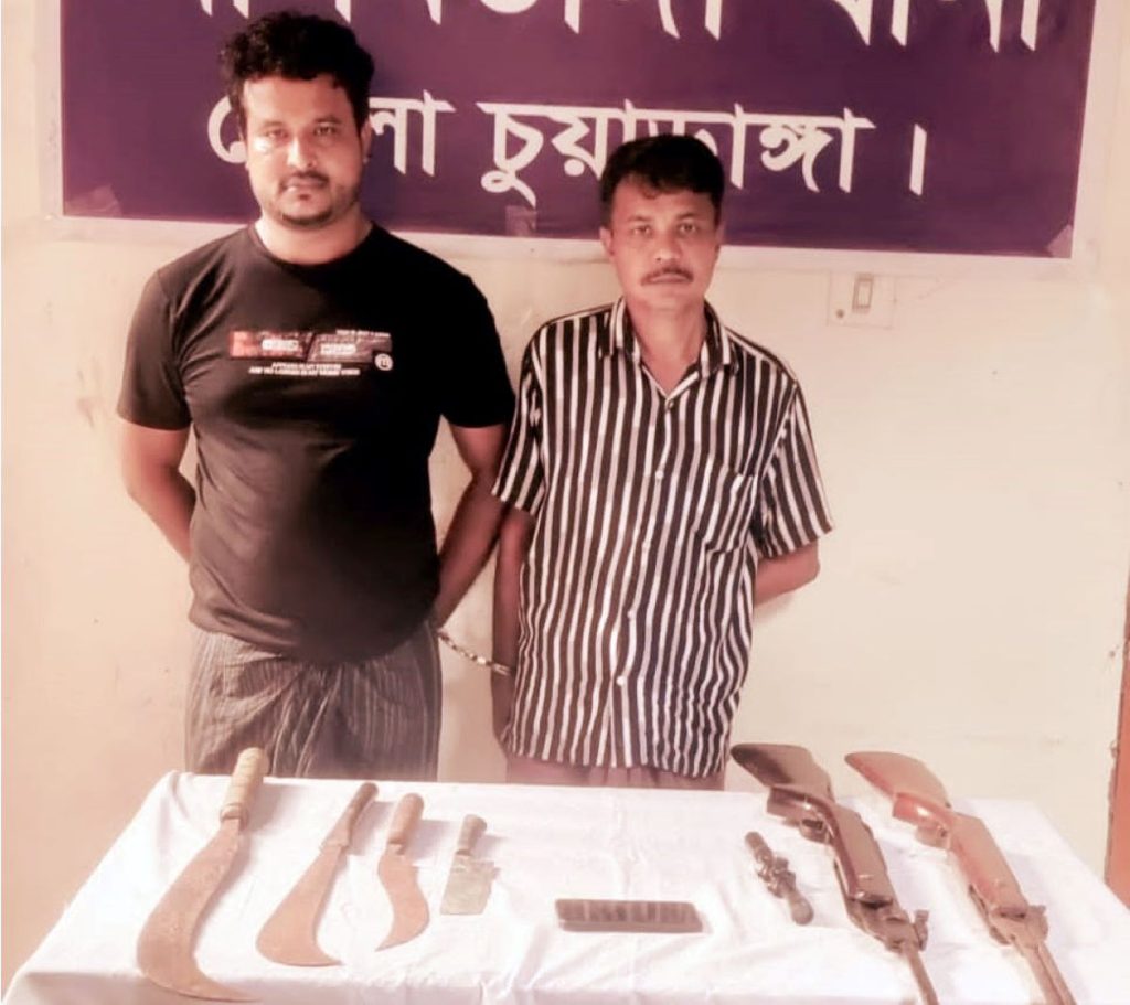 বাংলাদেশ সেনাবাহিনীর হারদী অস্থায়ী আর্মি ক্যাম্পের ক্যাপ্টেন সৌমিক আহমদে অয়ন এর নেতৃত্বে এসআই এসএম নিয়ামুল হক সংগীয় ফোর্সসহ যৌথ অভিযান পরিচালনা কালে গতকাল ভোর চারটার দিকে গোপন সংবাদের ভিত্তিতে আলমডাঙ্গা পৌর এলাকার এরশাদপুর গ্রামের মৃত বজলুর রহমানের ছেলে রুহুল আমিন (৪৫) কে তার বসত বাড়ী হতে ০২ টি এয়ারগান, ০১টি রাইফেলের স্কোপ, ০১টি রামদা (ছোরা সদৃশ) সহ গ্রেফতার করে। এবং নওদাবন্ডবিল গ্রামের ঠান্ডু রহমানের ছেলে তারফি হাসান(৩২) কে তার বসত বাড়ী হতে ০১টি রামদা, ০১টি ছোরা, ০১টি স্টেইনলেস স্টিলের চাপাতি, ০১টি কালো রং এর বিভো স্মার্ট ফোনসহ গ্রেফতার করে। আসামীদের বিরুদ্ধে আলমডাঙ্গা থানায় মামলা করা হয়েছে। জিজ্ঞাসাবাদ শেষে চুয়াডাঙ্গা আদালতে প্রেরণ করা হয়েছে।